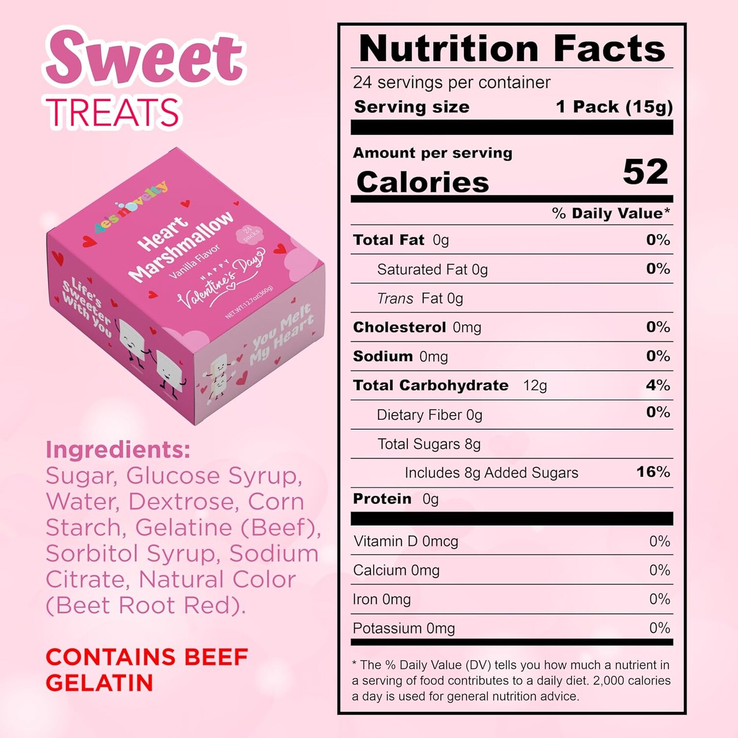 4E's Novelty Heart Marshmallows (24 Packets), Heart Shaped Marshmallows Mini Individually Wrapped Valentines Candy Bulk for Kids Classroom Exchange, Fun Valentine Marshmallow Hearts & Party Favors