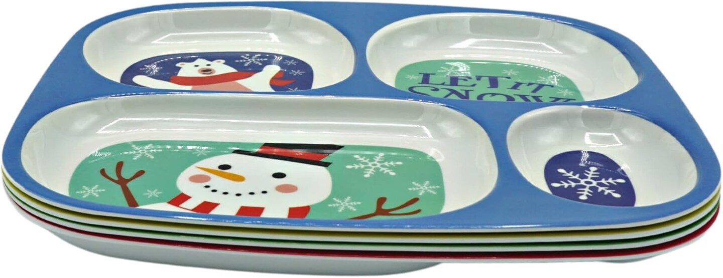 4E's Novelty Kids Christmas Divided Plates – 4-Pack BPA-Free Melamine Holiday Dinnerware 1000-Character De