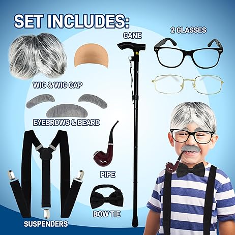 4E's Novelty Old Man Costume 10 Pcs Set for Kids ages 3-14 Years - 100 Days of School Costume for Boys Dress Up Accessories Includes Wig Cane