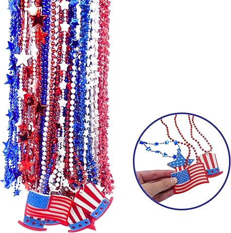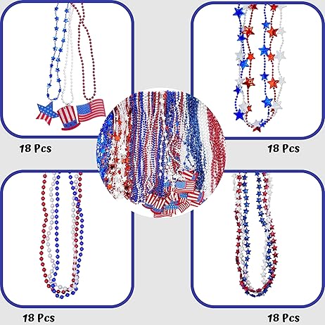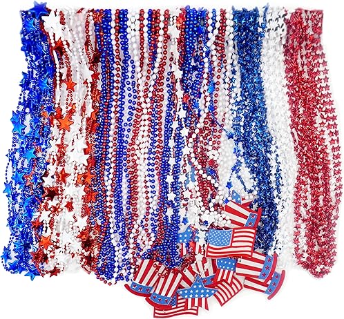 4E's Novelty Patriotic Beads – 72 Pack Red White Blue Beaded Necklaces, 4th of July Party Favors