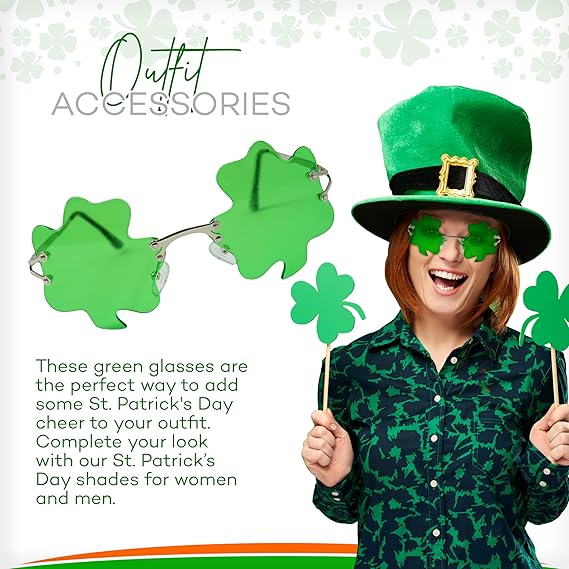 4E's Novelty Set of 2 Green Sunglasses for Adults, Shamrock & Heart Shaped, St Patricks Day Glasses for Women & Men Party Outfit Accessories