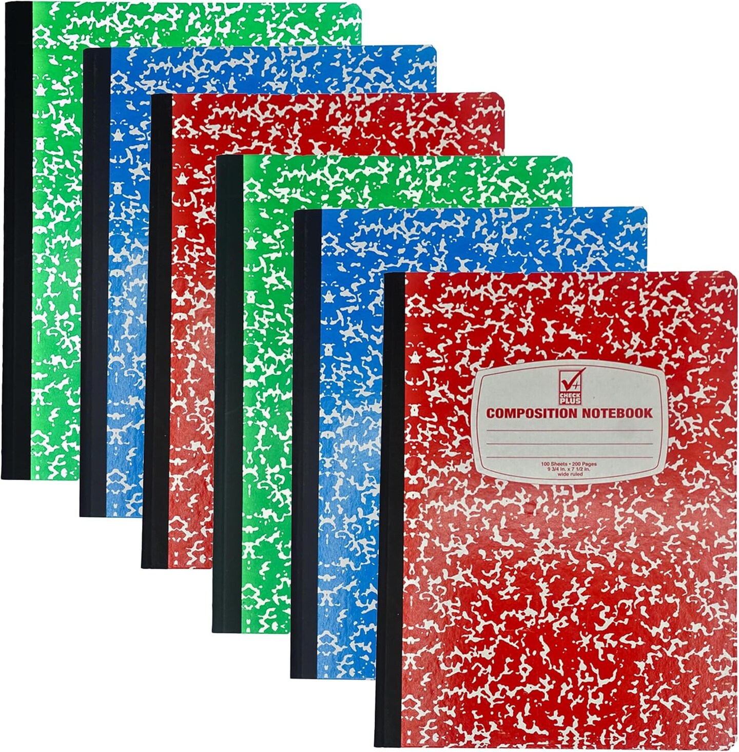 4E's Novelty Wide Ruled Composition Notebooks - Pack of 6- Hard Cover 100 Sheets 9.75" x 7.5" - Red Blue Green Cute Marble Colors, Bulk Compositon Book Wide Ruling, Back to School Supplies