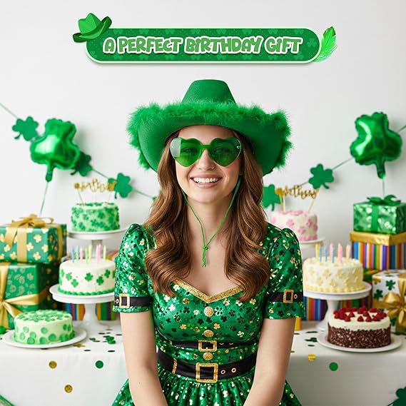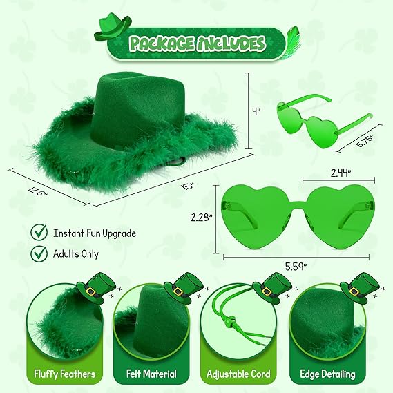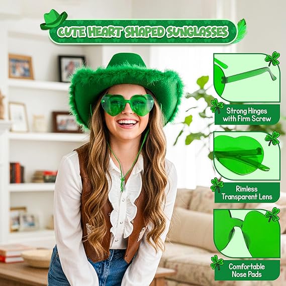 4E’s Novelty Green Cowboy Hat with Feathers & Heart-Shaped Sunglasses - Perfect Cowboy Outfit Accessory, Cowboy Hat for Party Costume Dress Up