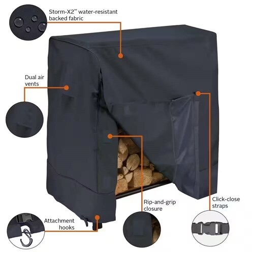 4-Foot Black Firewood Rack Cover Water-Resistant Polyester with Elastic Hem and Air Vents