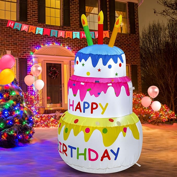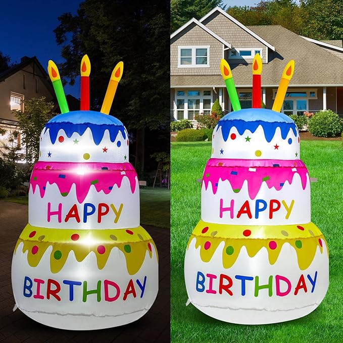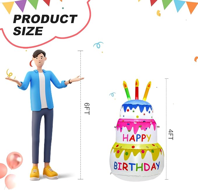 4FT Birthday Cake Party Outdoor Inflatable Decoration, Inflatable Decoration with LED Lights, Suitable for Gardens, Patios, and Lawns.