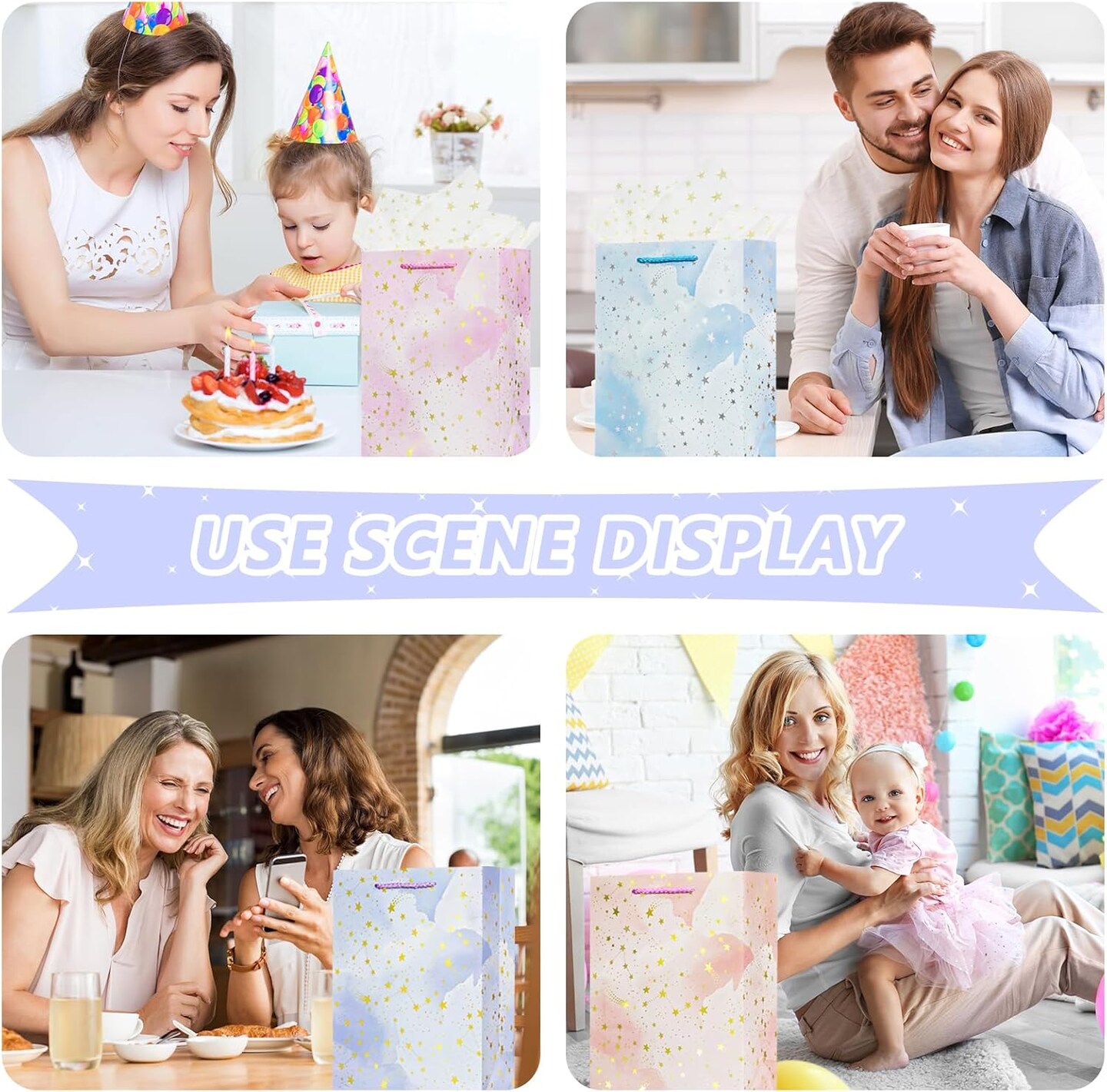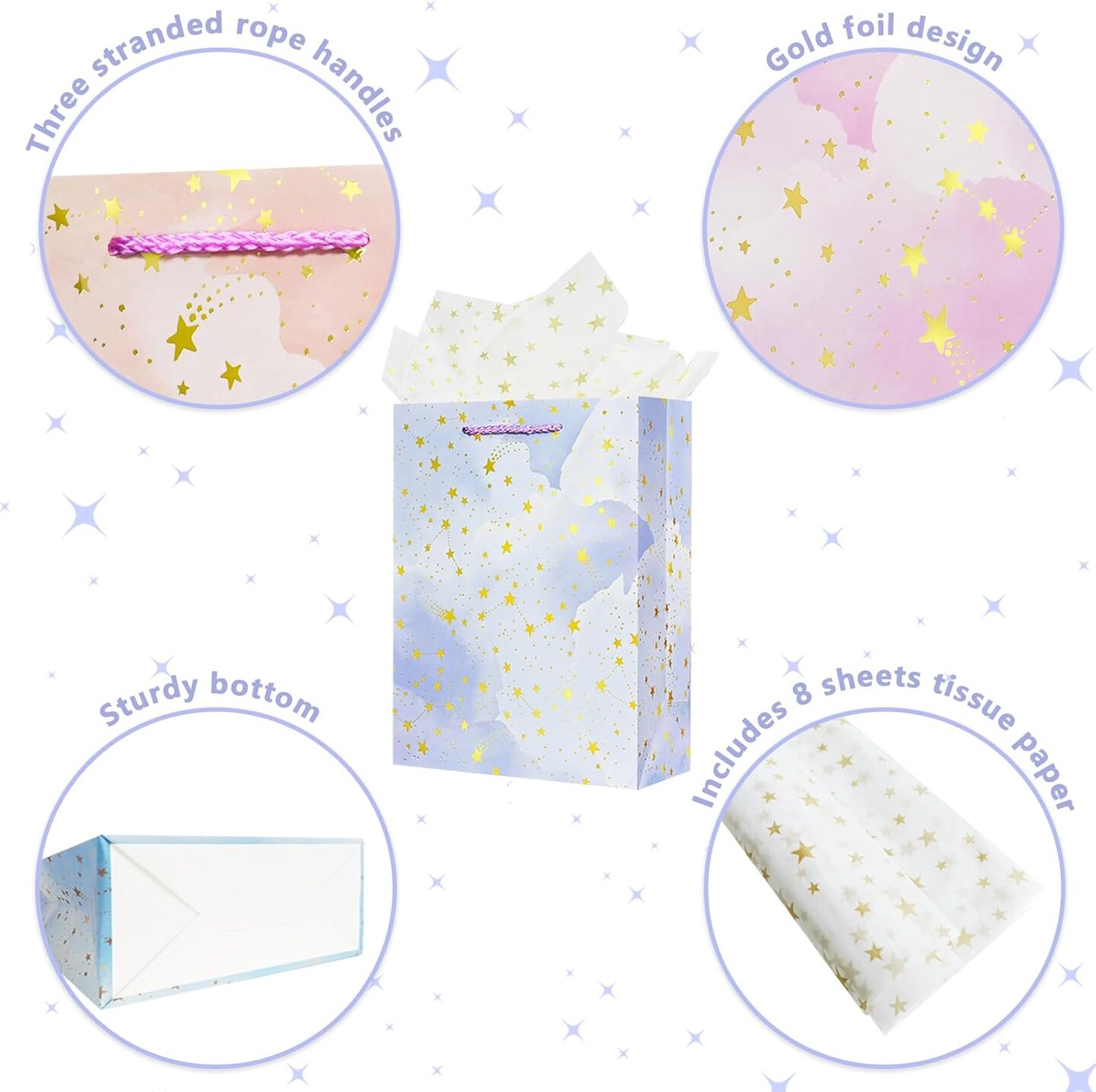 4-Pack 9" Small Star Gift Bags with Handles – Includes Tissue Paper for Birthdays, Parties, Weddings, and Baby Showers