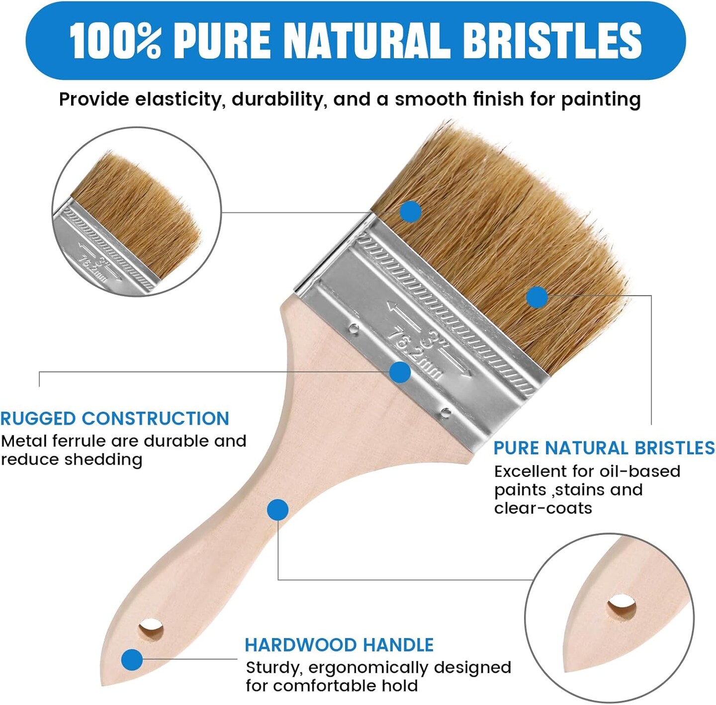 4Pack Household Chip Paint Brush 3inch Natural Bristles Wooden Handle Flat Brushes Set for Painting, Glue, Oil, Acrylic, Stain