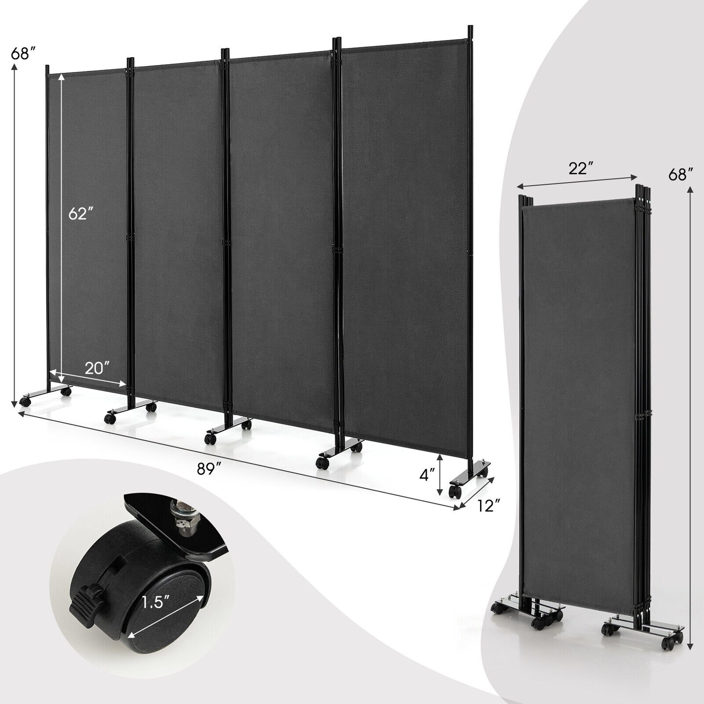 4-Panel Folding Room Divider 6 Feet Rolling Privacy Screen with Lockable Wheels