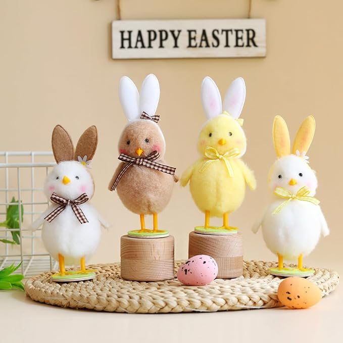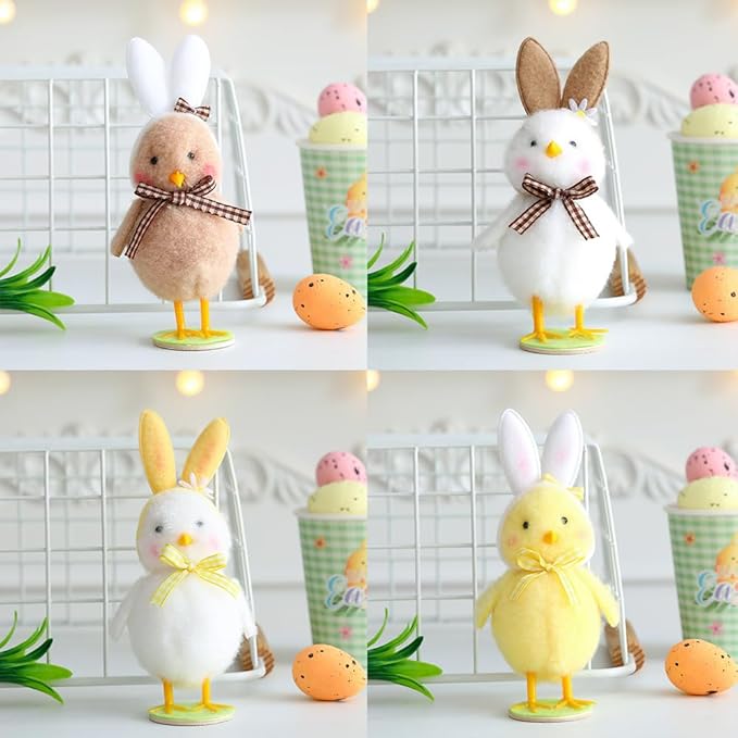 4Pcs Plush Easter Chicken with Bunny Ear Hat Decorations, 5.6inch Cute Mini Standing Chicks Figurine, Plush Animals Statue Tabletop Decor Easter Gift Spring Home Party Favors