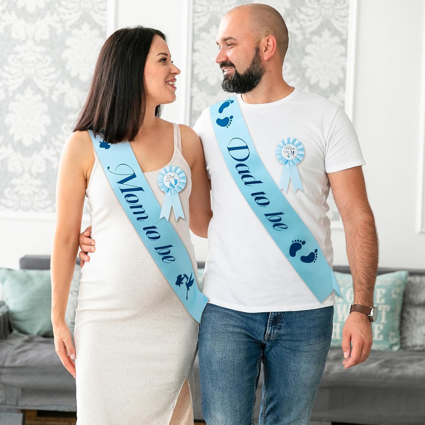 4Pcs Stork Maternity Sash Set Blue Stork Mom to Be & Dad to Be Sash Kit with Corsage Pin Stork Theme Pregnancy Sash Keepsake for Boy and Girl Baby Shower Gender Reveal Party
