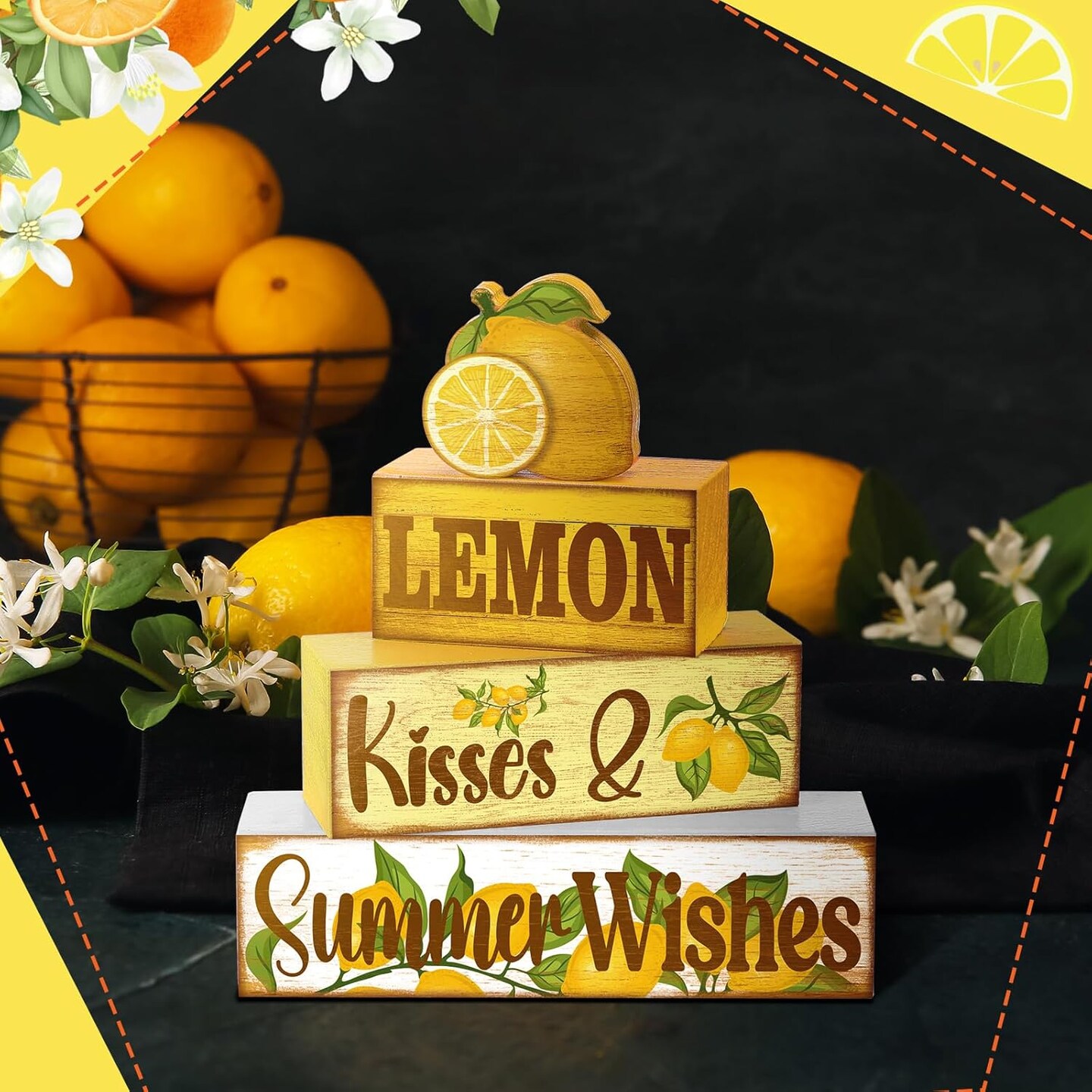 4-Piece Lemon Summer Tiered Tray Decor – Rustic Wooden Signs & Faux Book Stack Farmhouse Table Centerpiece for Mantel, Shelf & Fireplace