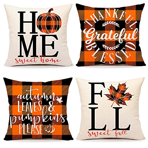 4TH Emotion Fall Decor Pillow Covers 18x18 Set of 4 Thanksgiving Buffalo Check Farmhouse Decorations Orange Black Pumpkin Maple Leaves Outdoor Decorative Throw Cushion Case for Home Couch TH025-18