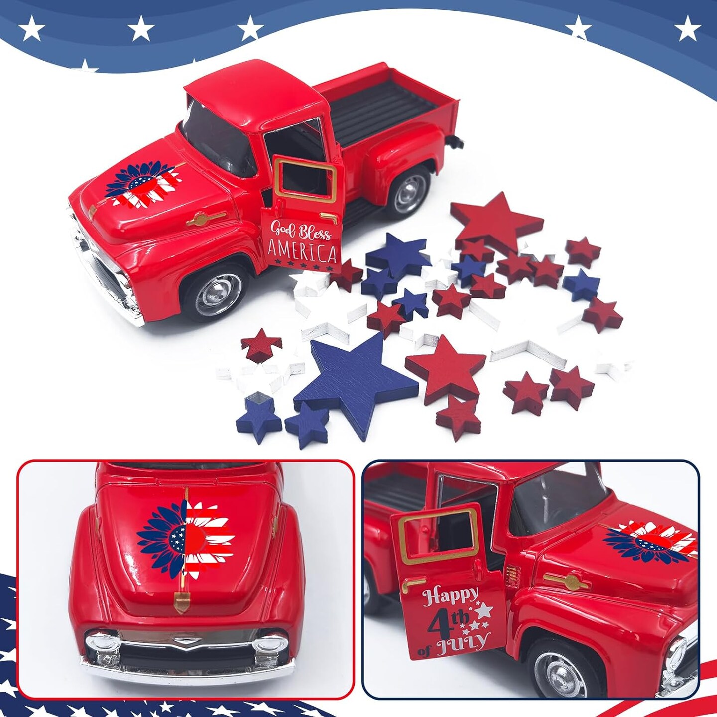 4th of July Decorations Farmhouse Metal Truck with Wooden Stars Sign Fourth of July Decor Patriotic Centerpieces for Tables Independence Day Memorial Day Red White and Blue Tiered Tray Decor for Home