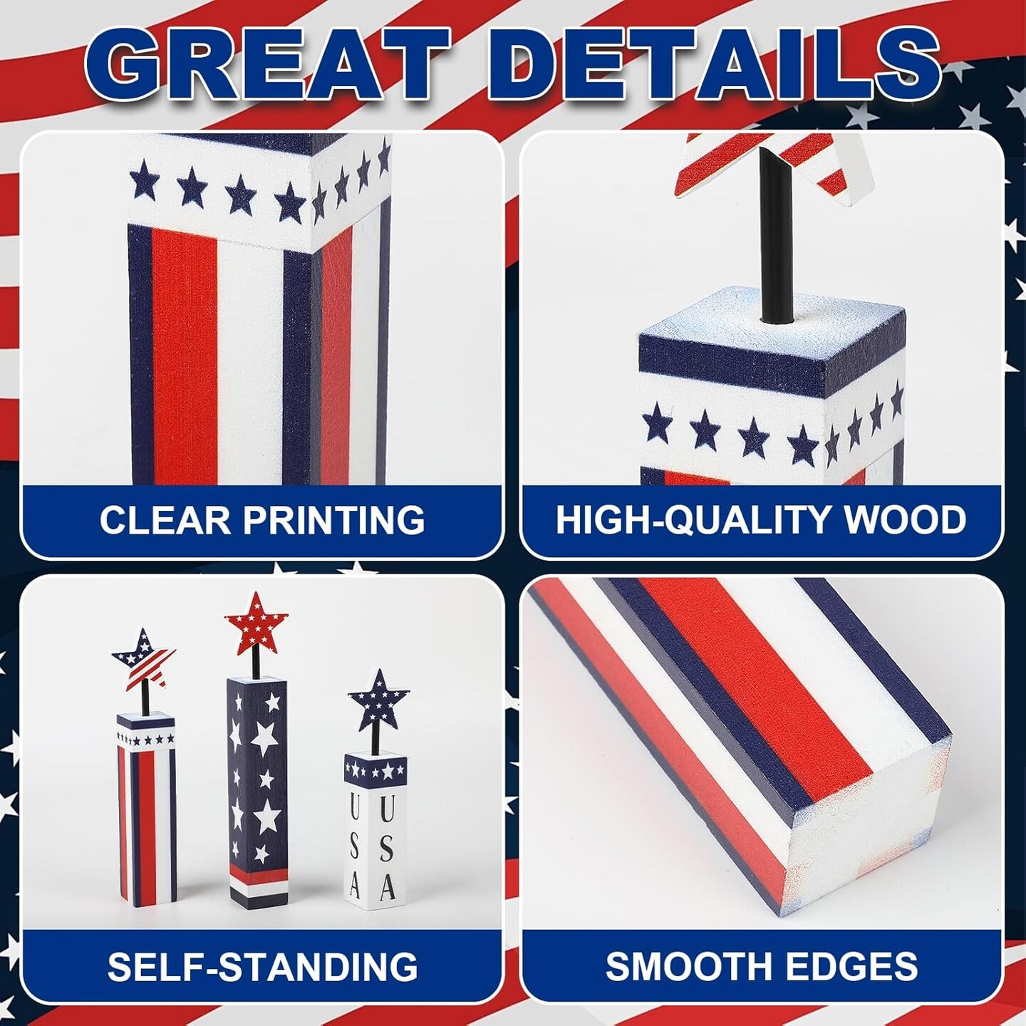 4th of July Decorations Set, Red White Blue Decor, Wooden Patriotic Memorial Day Tiered Tray Decor, Labor Day Decorations, Fourth of July Decoration for Home Office Table (Flag Printed)