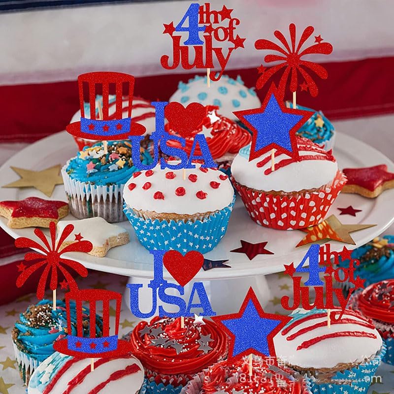 4th Of July Gillter Cupcake Toppers Decorations Patriotic Independence Day Party Supplies