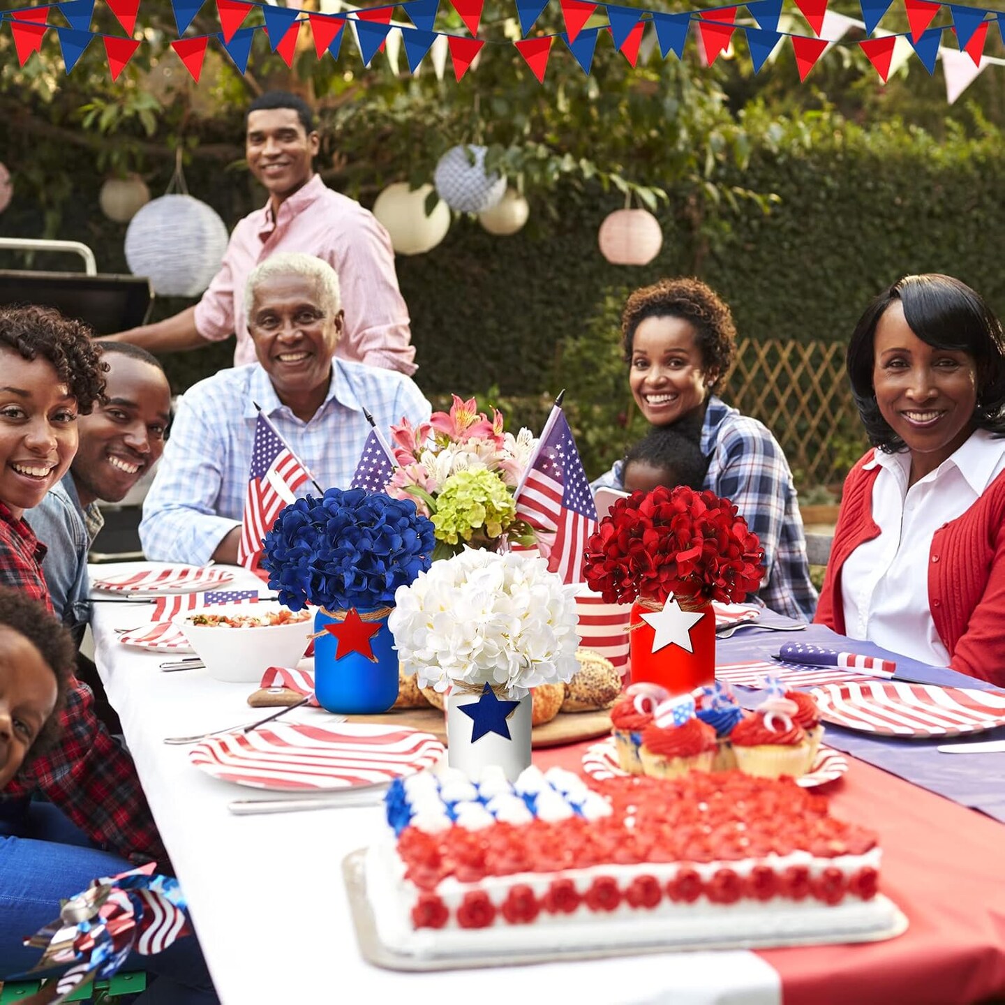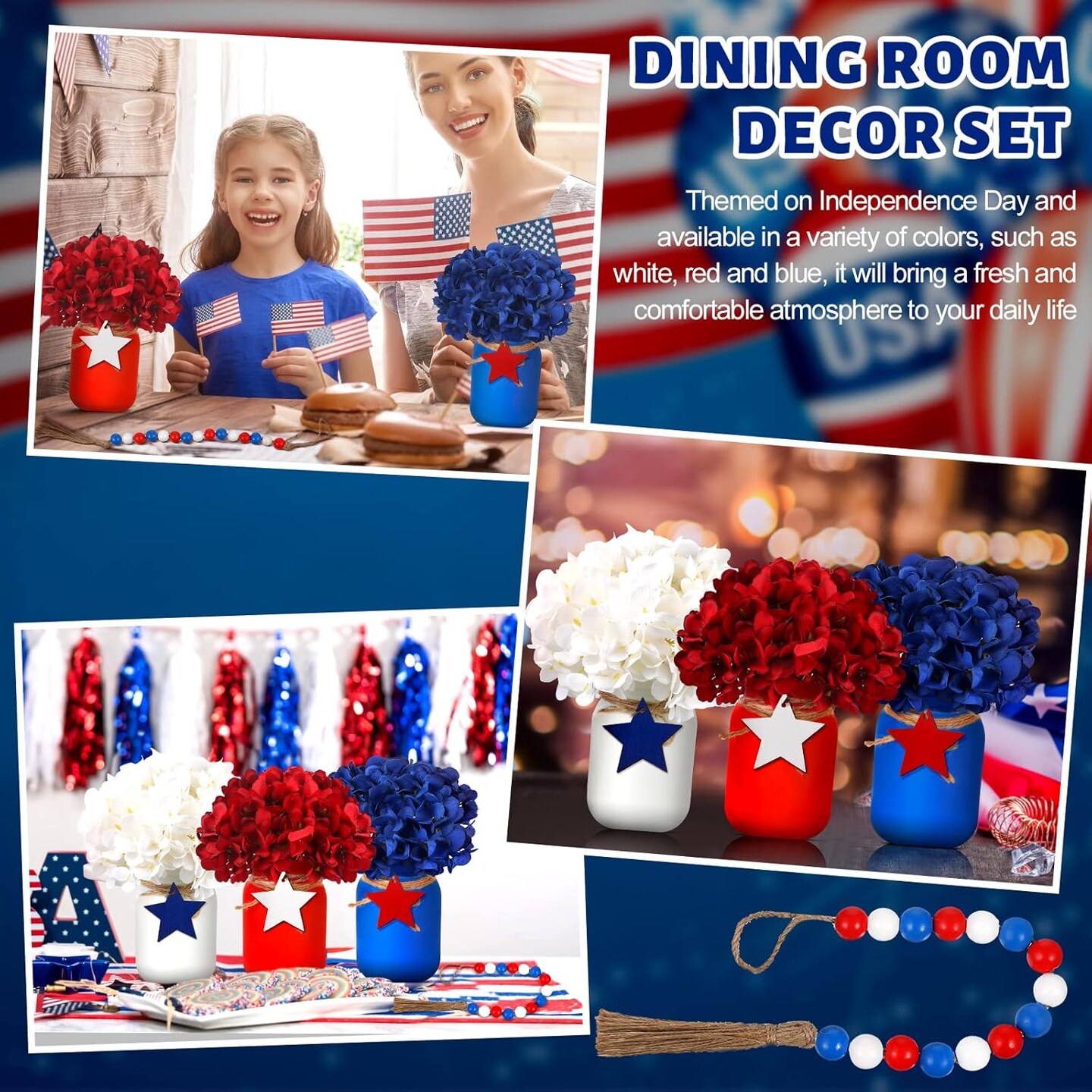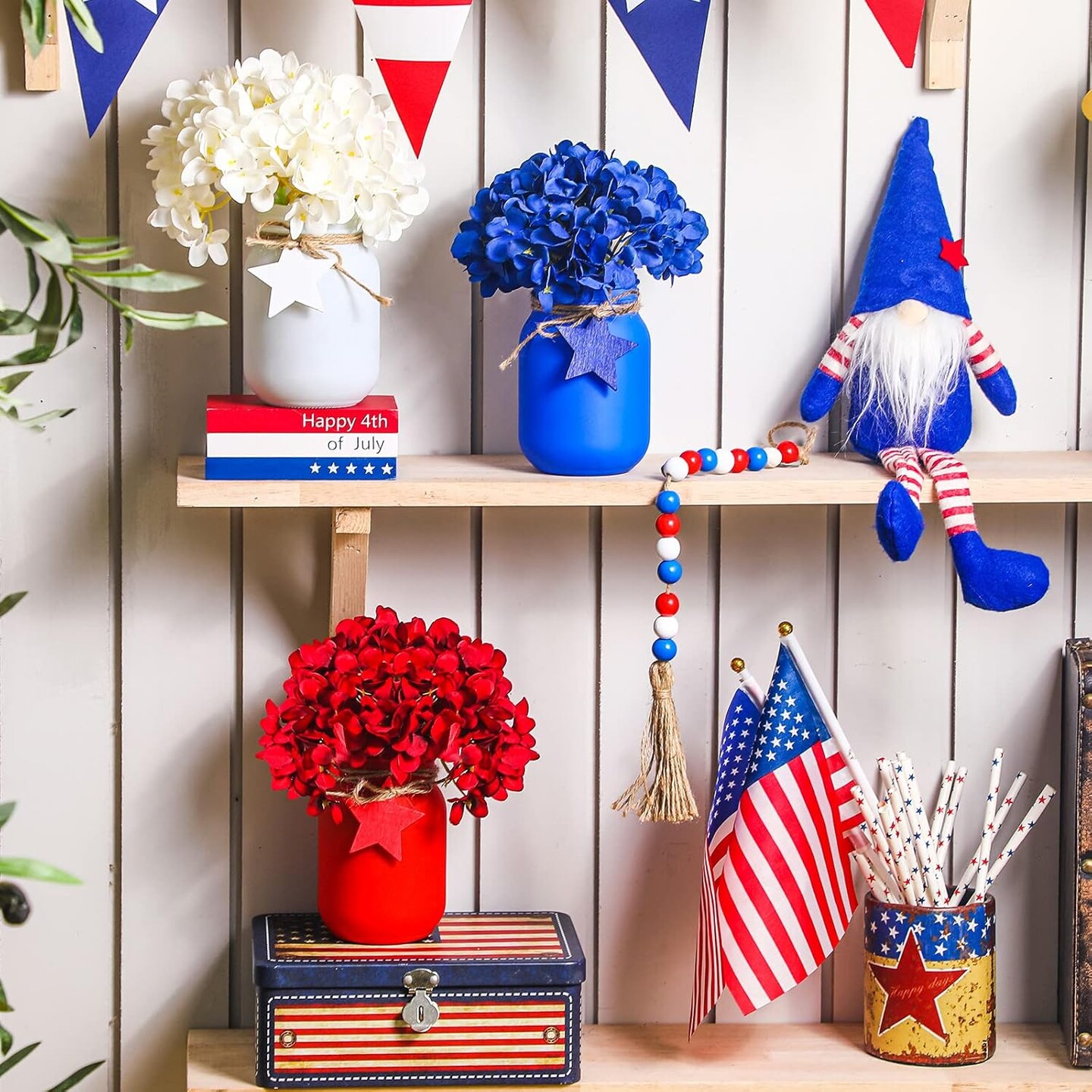 4th of July Mason Jar Table Decor – 13 Pcs Patriotic Centerpiece Set with Flowers & Garland