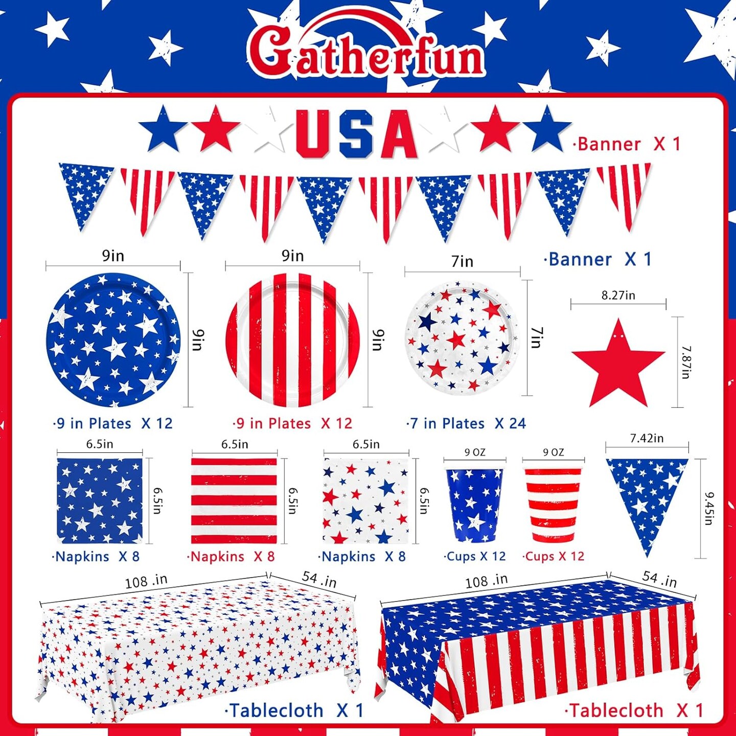 4th of July Party Supplies Set, Patriotic Theme Kit for Independence & Election Day Decorations, Includes Plates, Napkins, Cups, Banner, Tablecloth -Patriotic & 4th of July Party Decorations-24 Guests