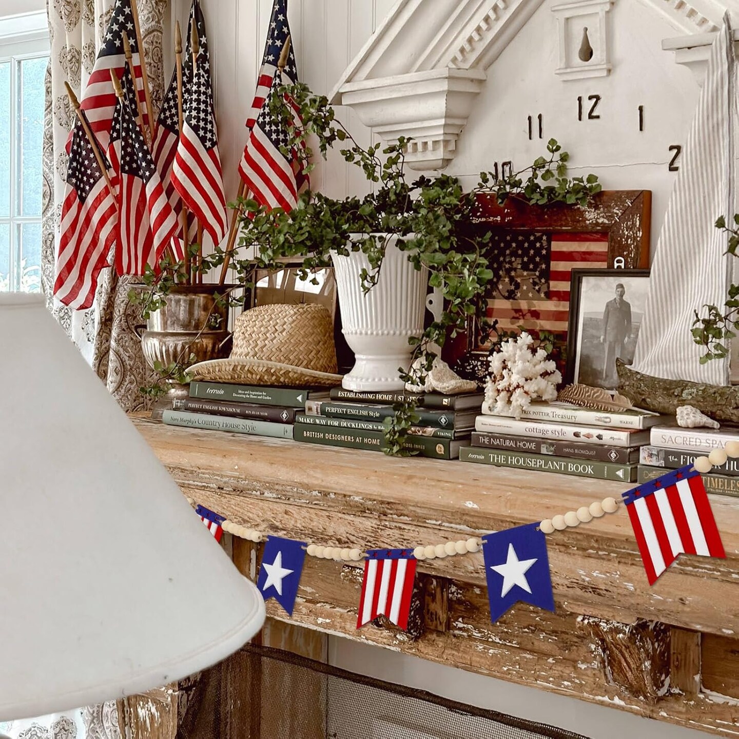 4th of July Patriotic American Flag Wood Bead Garland - Independence Day Decorations for Fireplace Mantle, Red White Blue Decor for Memorial Day, Veterans Day & Party Supplies