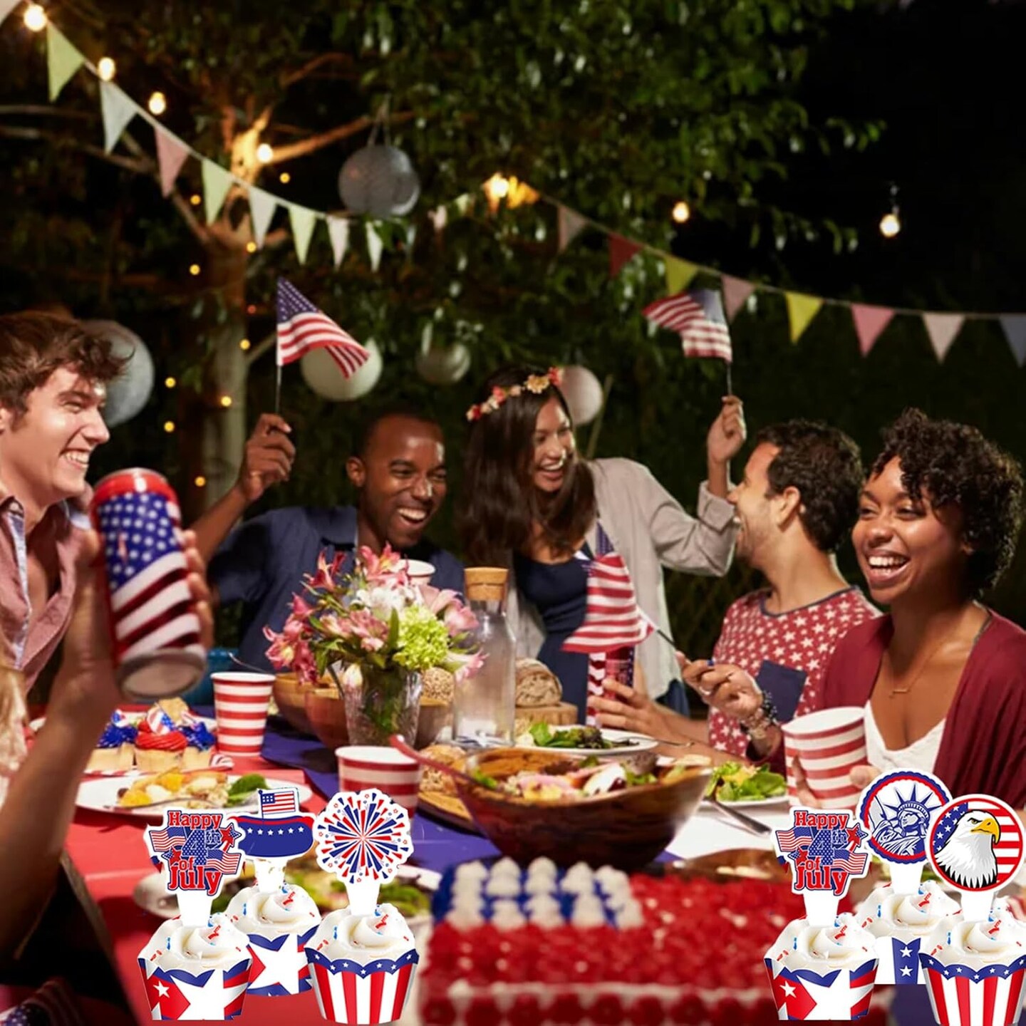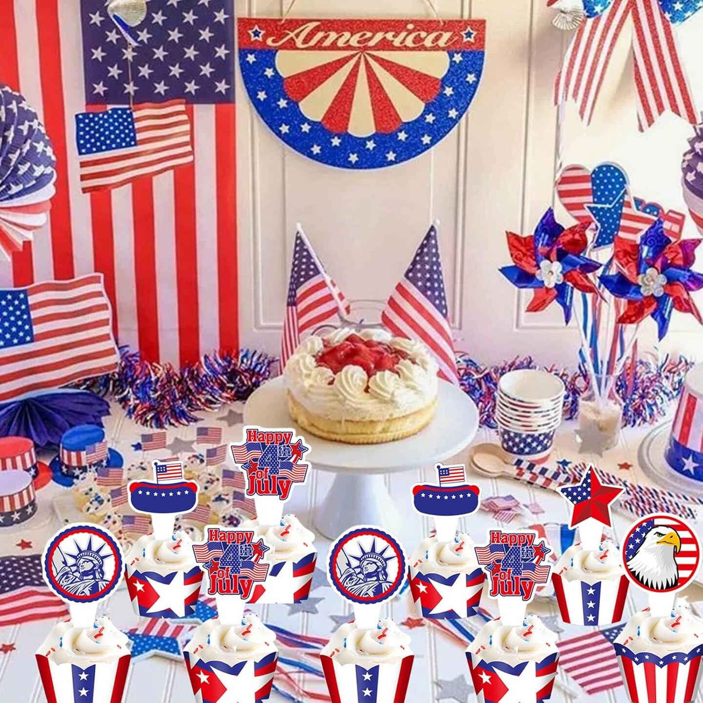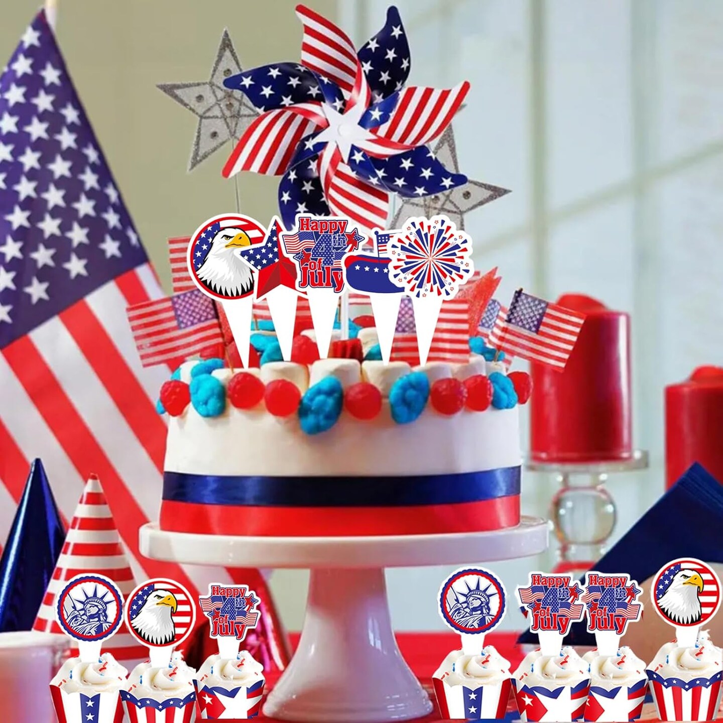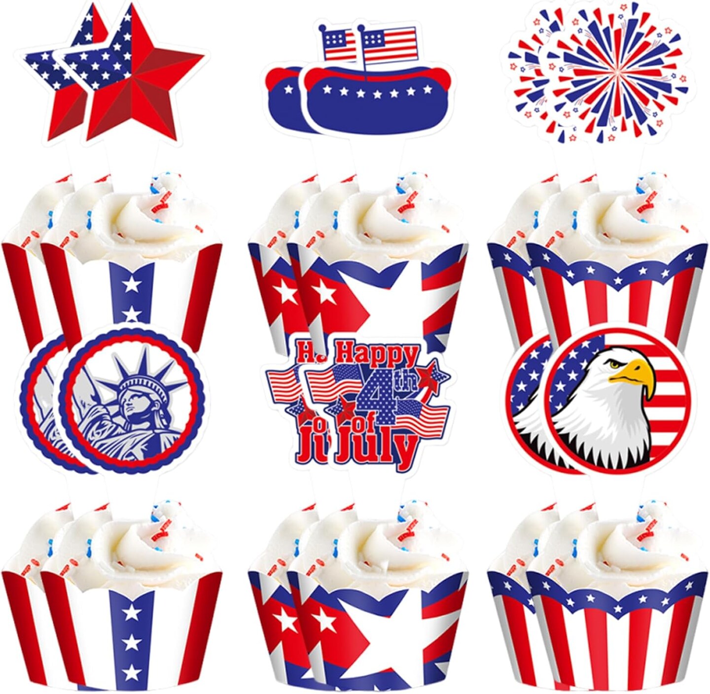4th of July Patriotic Cupcake Toppers Independence Day Cupcake Topper Wrappers Liners Flag Star Design Cake Decorations for Memorial Day Parade Party Supplies (24 Pcs)