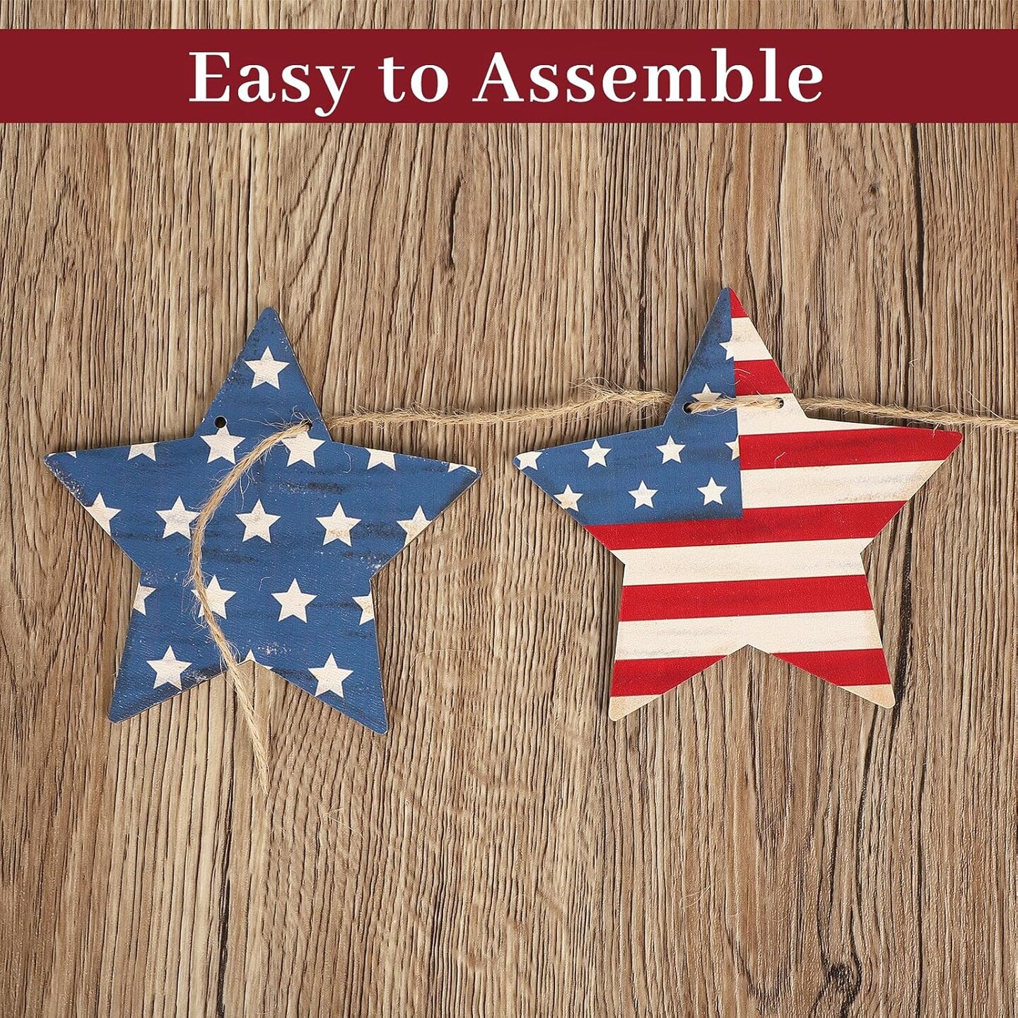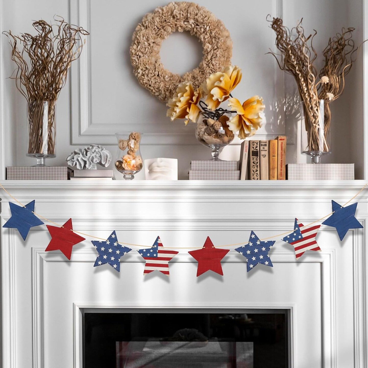 4th of July Patriotic Garland Decorations, Rustic Wooden Star Red White and Blue Garland Decor