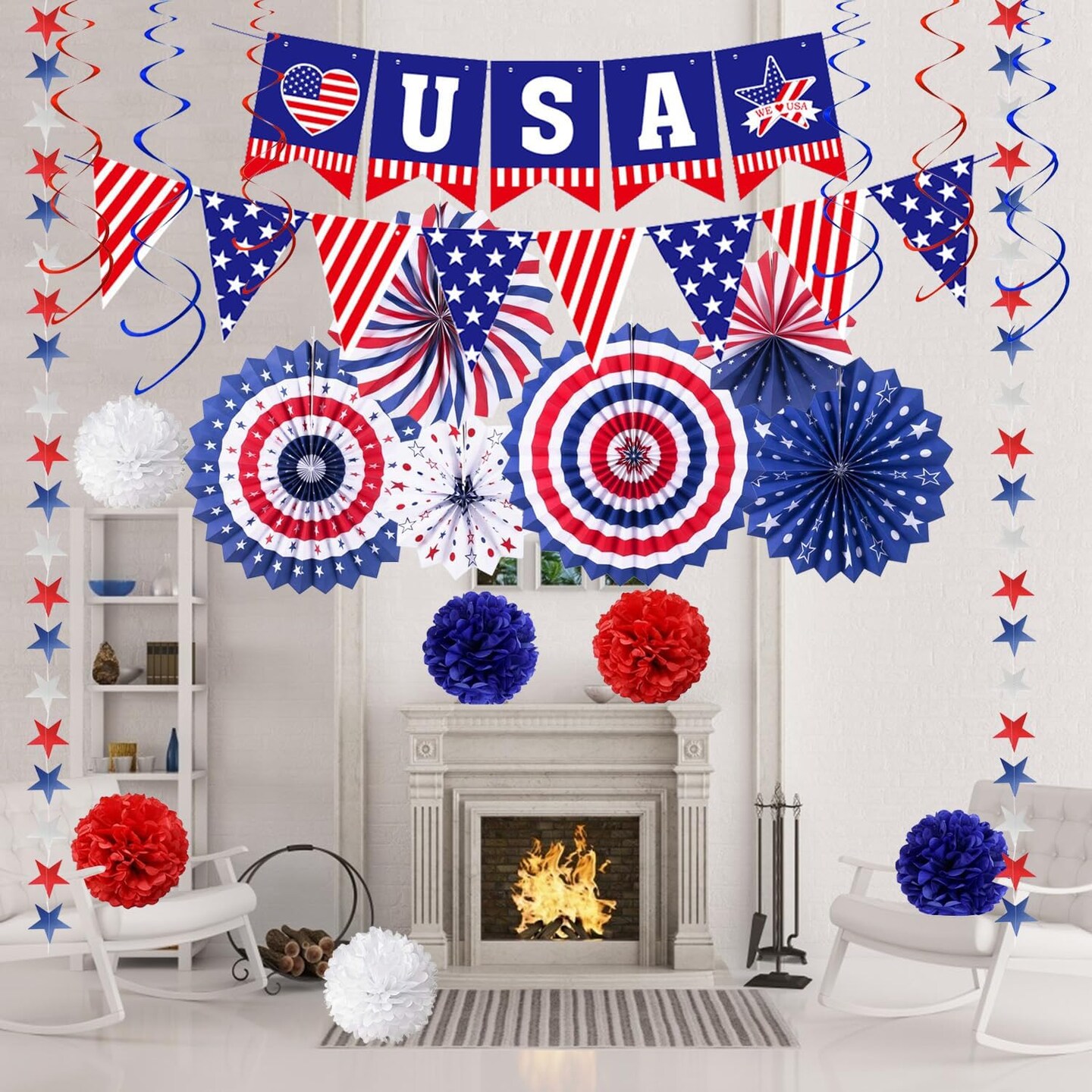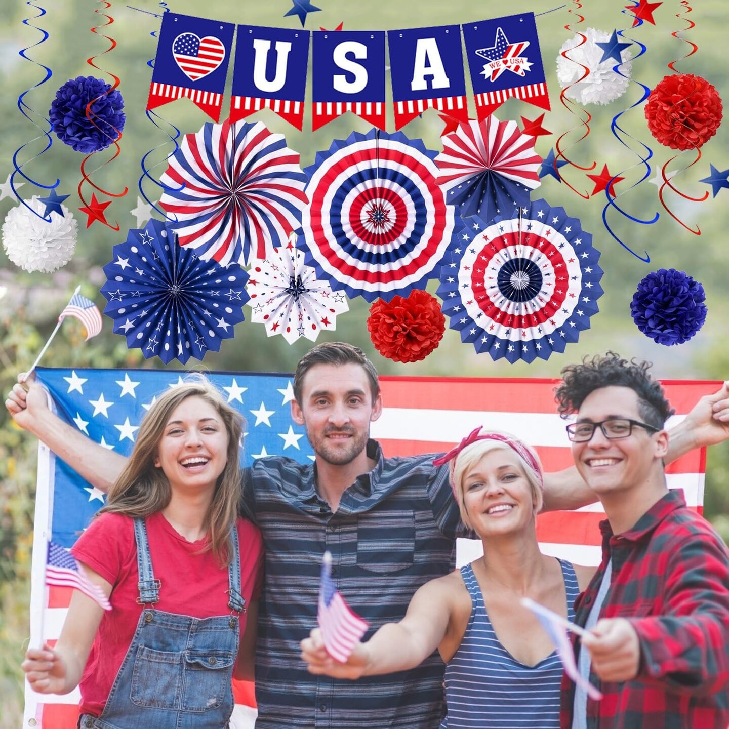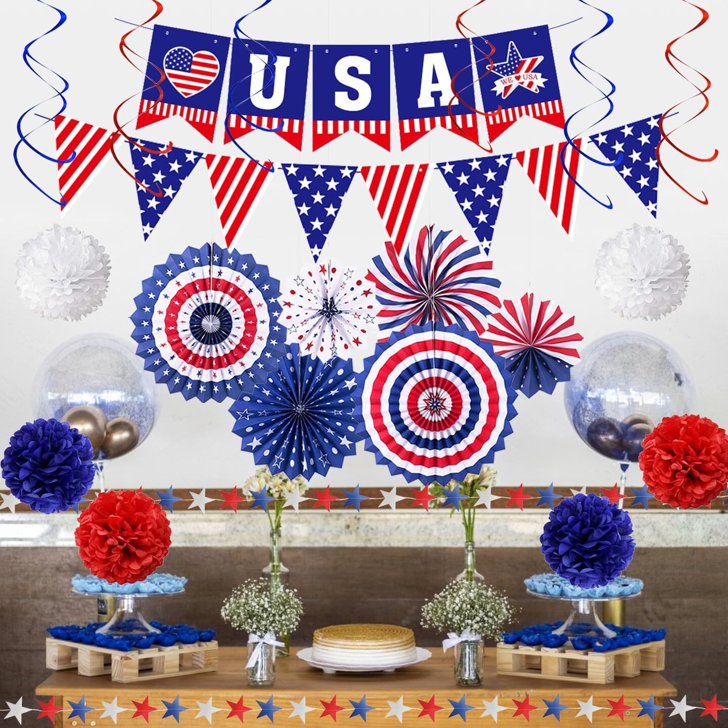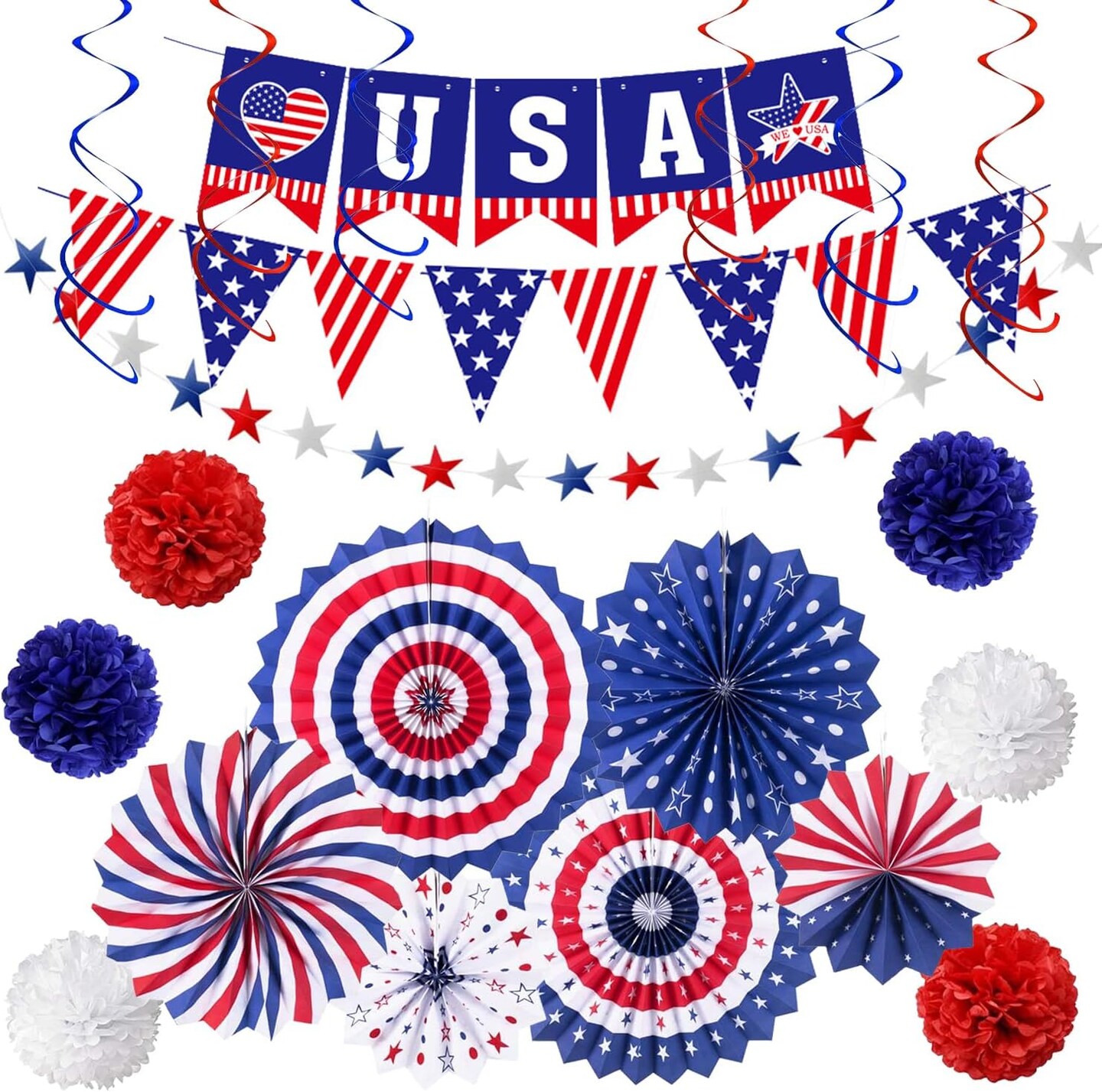 4th of July Patriotic Party Decorations, 6 Paper Fan, 6 Flower Ball, 1 USA Swallowtail Flag, 1 USA Pennant Flag, 1 Star Streamer, 6 Swirl, Independence Day