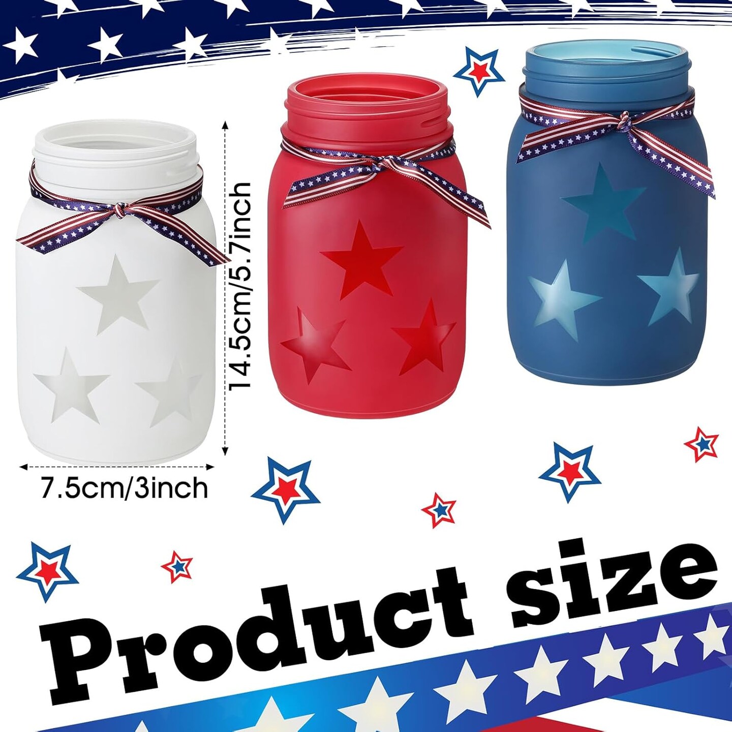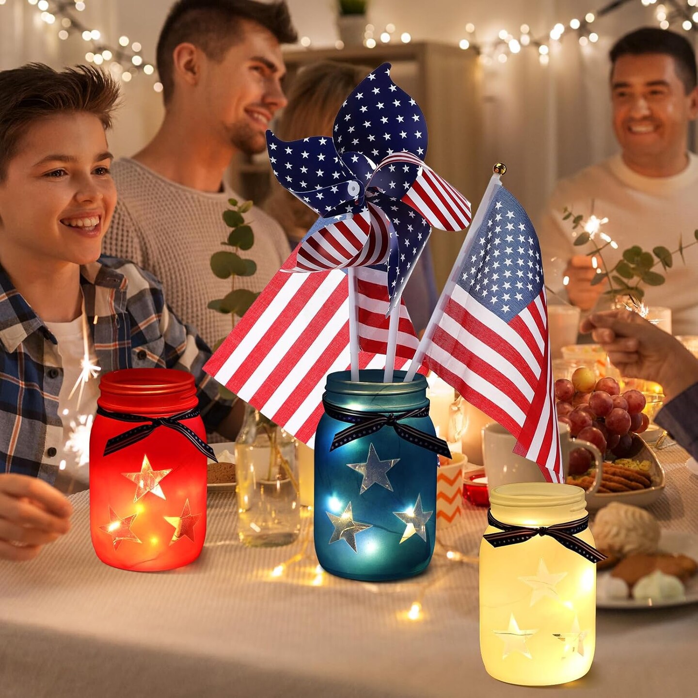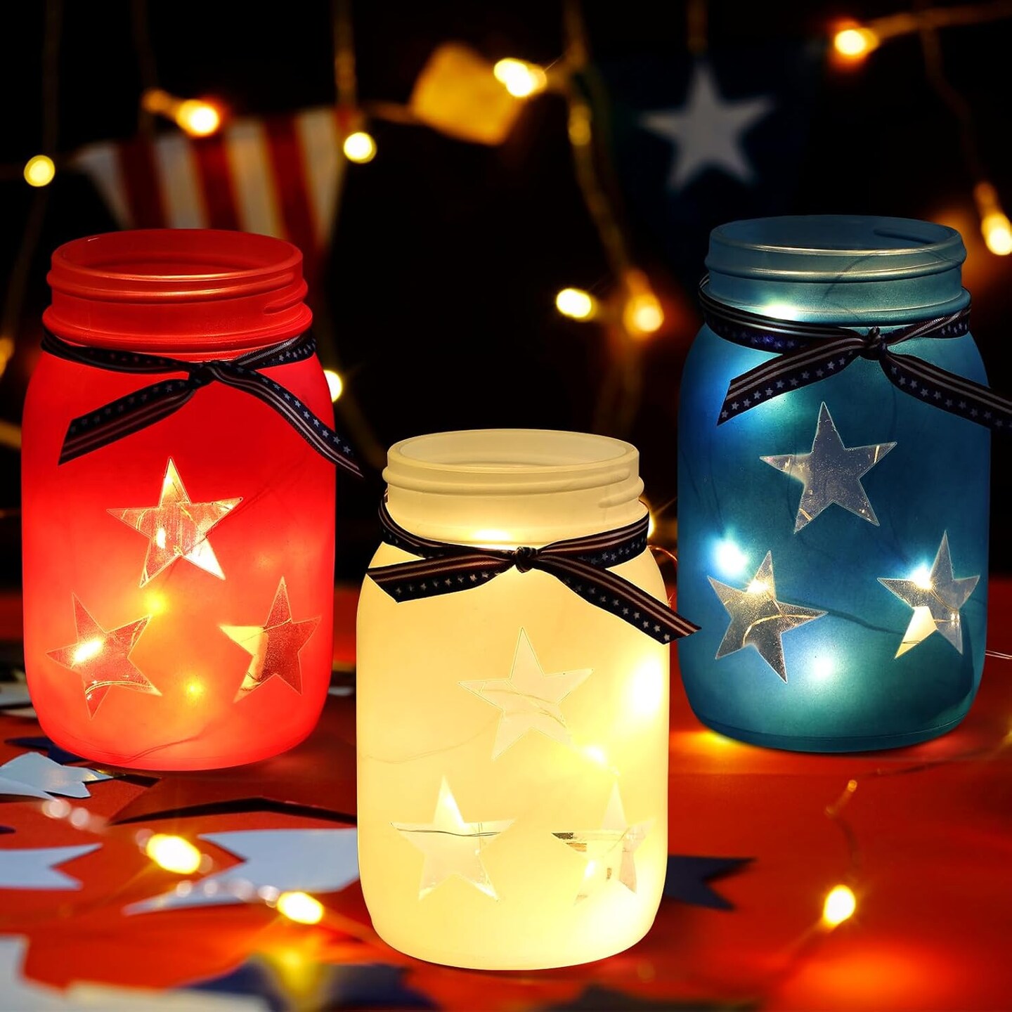 4th of July Patriotic Table Decoration Set Rustic Mason Jar Tea Light Candle Holders with String Lights for Independence Day Centerpiece Transparent Mason Jars Labor Day Supplies