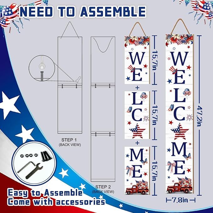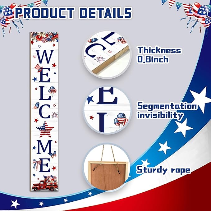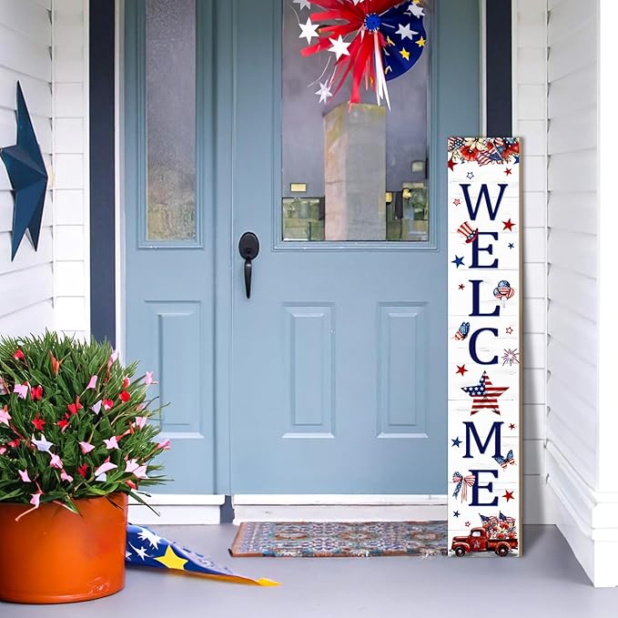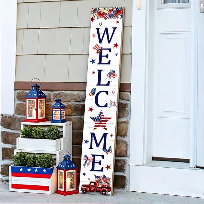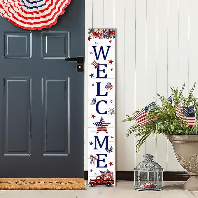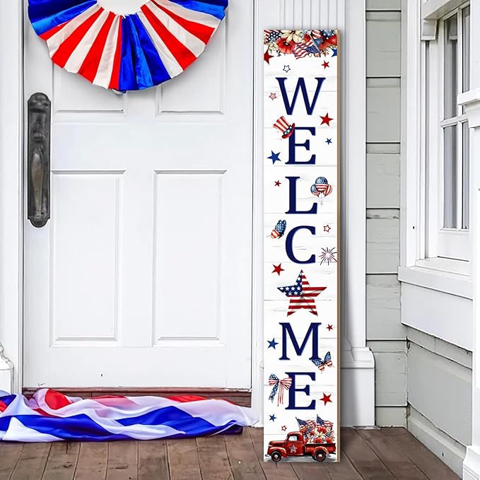 4th of July Patriotic Welcome Sign, American Flag Truck Wooden Porch Sign For Patio, 47" USA Flag Front Door Signs All Seasons Decor Standing Yard Signs Holiday Vertical Signs for Outdoor Indoor Wall Garden