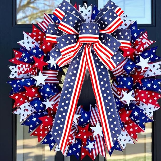 4th of July Patriotic Wreath Bow, Large Red White Blue Stars & Stripes Ribbon for Front Door, Memorial Day, Veterans Day & 250th Anniversary Outdoor Decorations