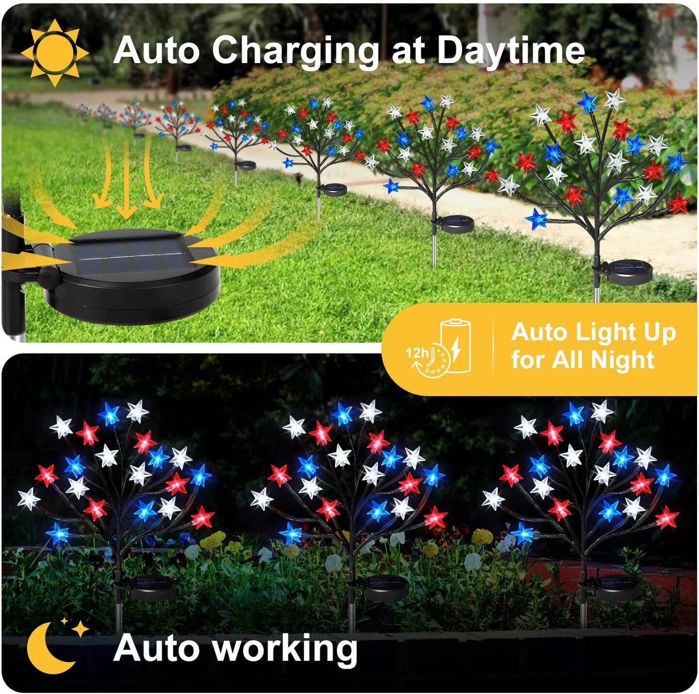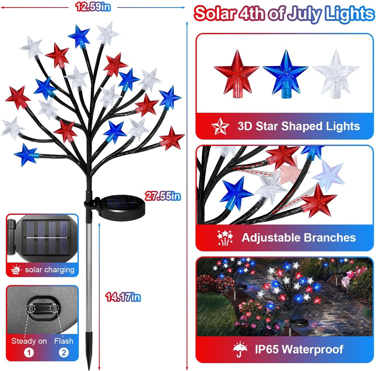 4th of July Solar Star Tree Lights Decorations Outdoor, Waterproof Red White and Blue Lights for Fourth of July Decor, Patriotic Decorations for Garden Yard Pathway Patio (2)