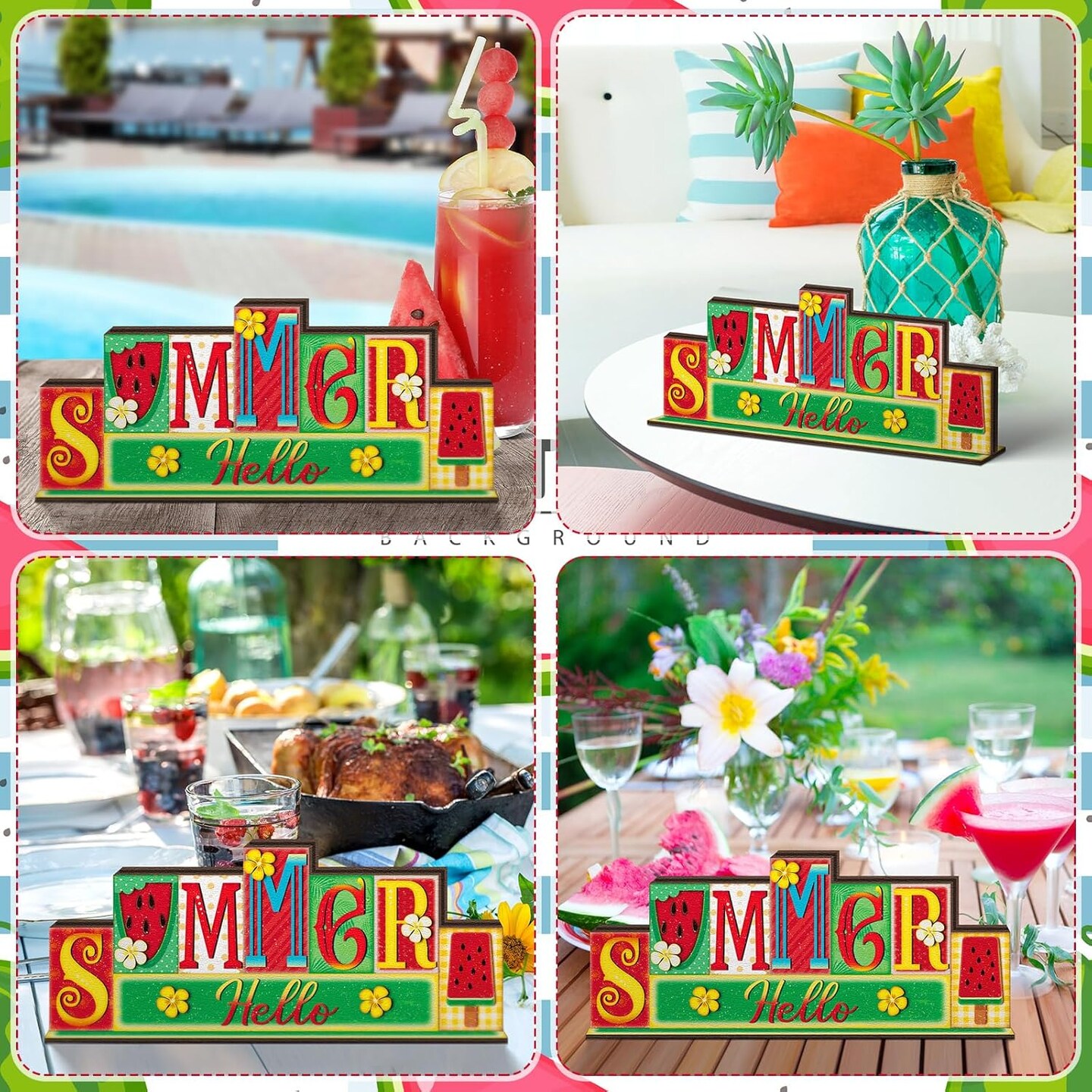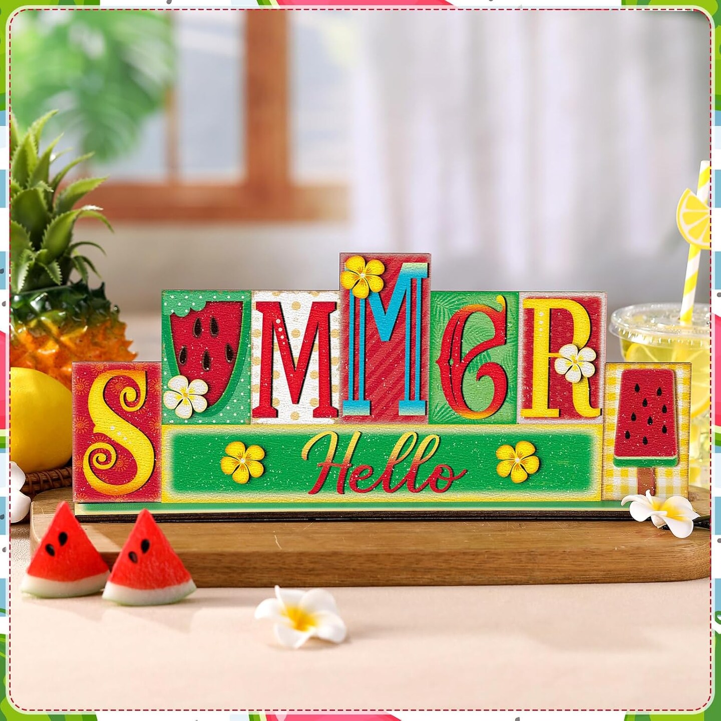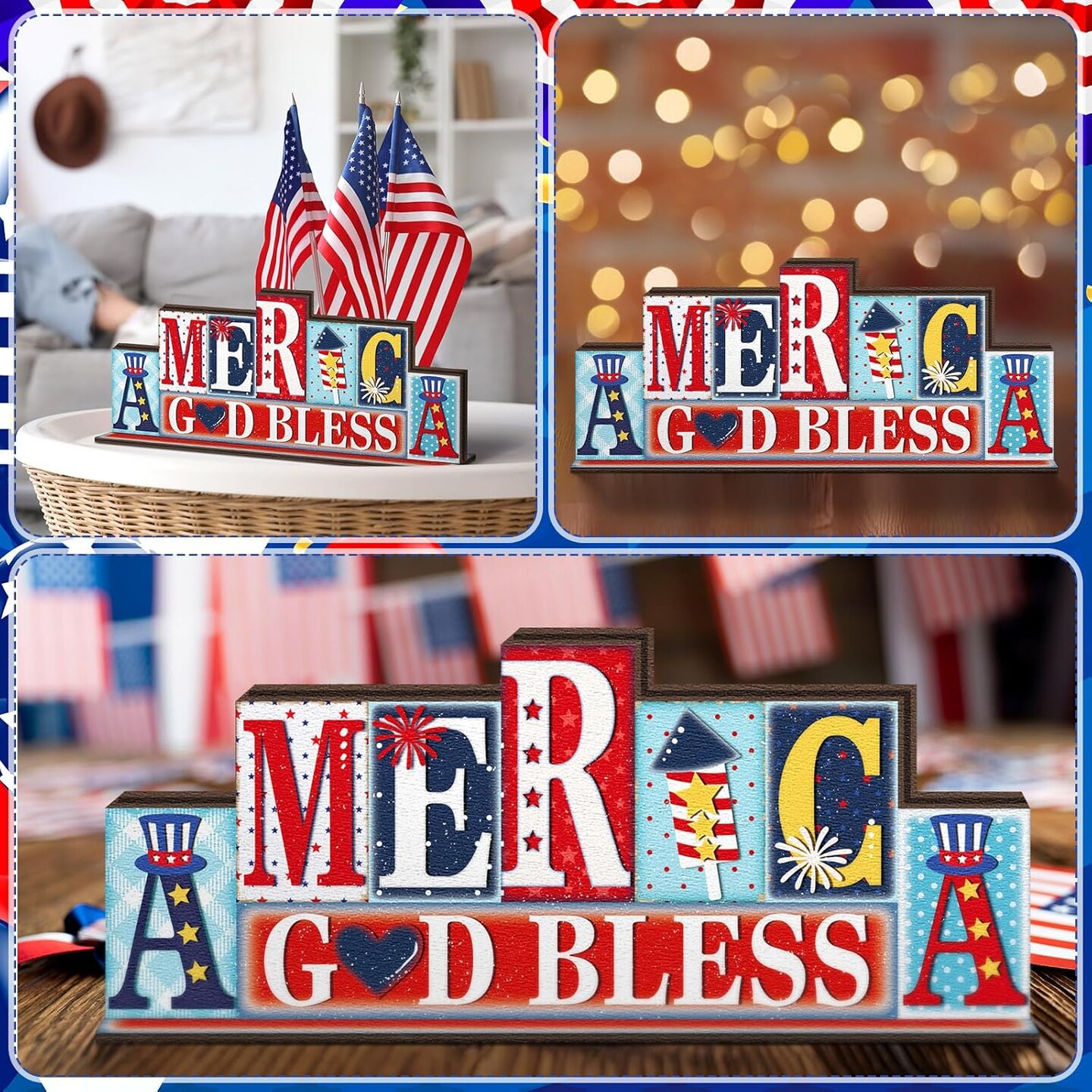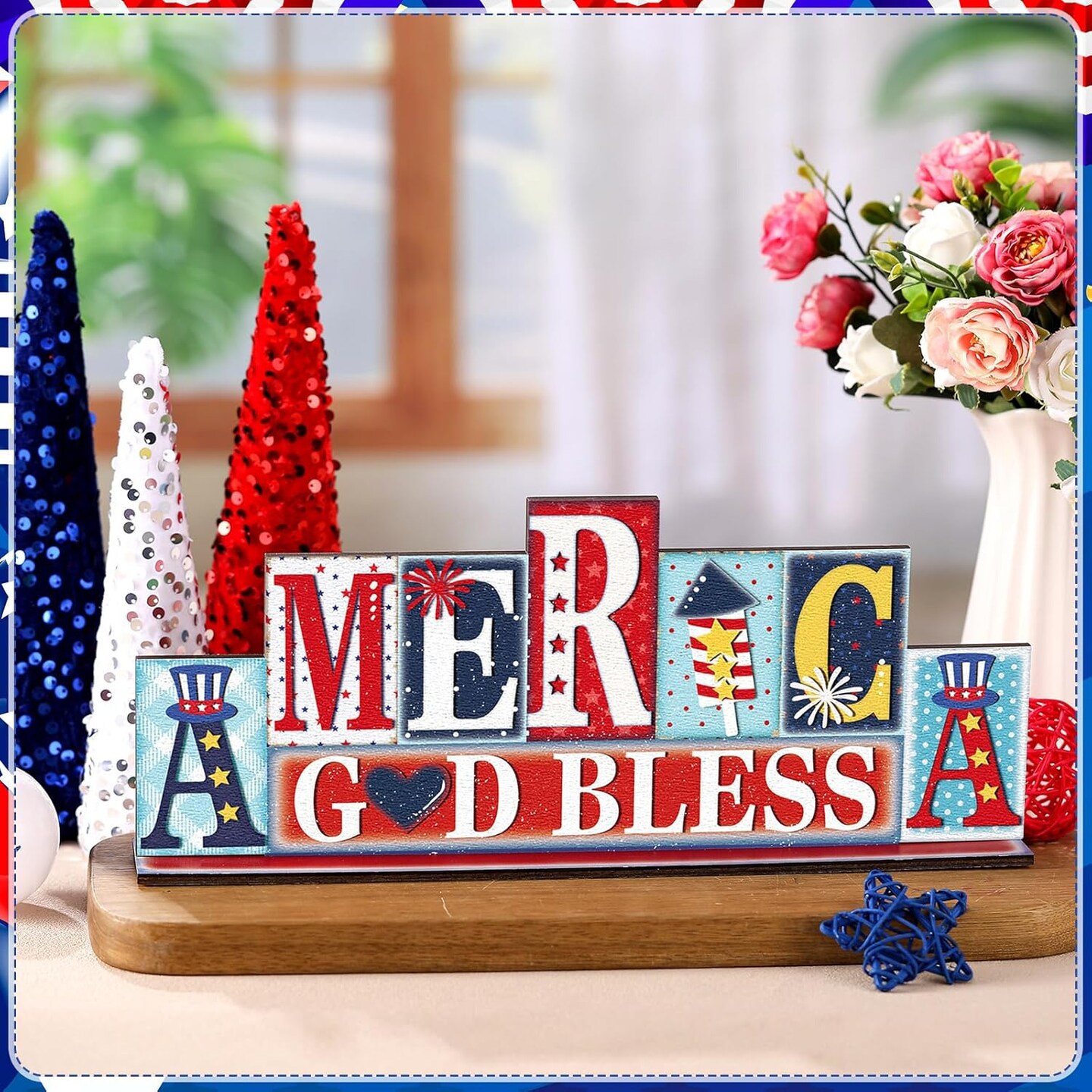 4th of July Summer Table Decor Reversible Patriotic Memorial Day Tabletop Sign Hello Summer Gold Bless America Letter Table Centerpiece Red White Blue Decor