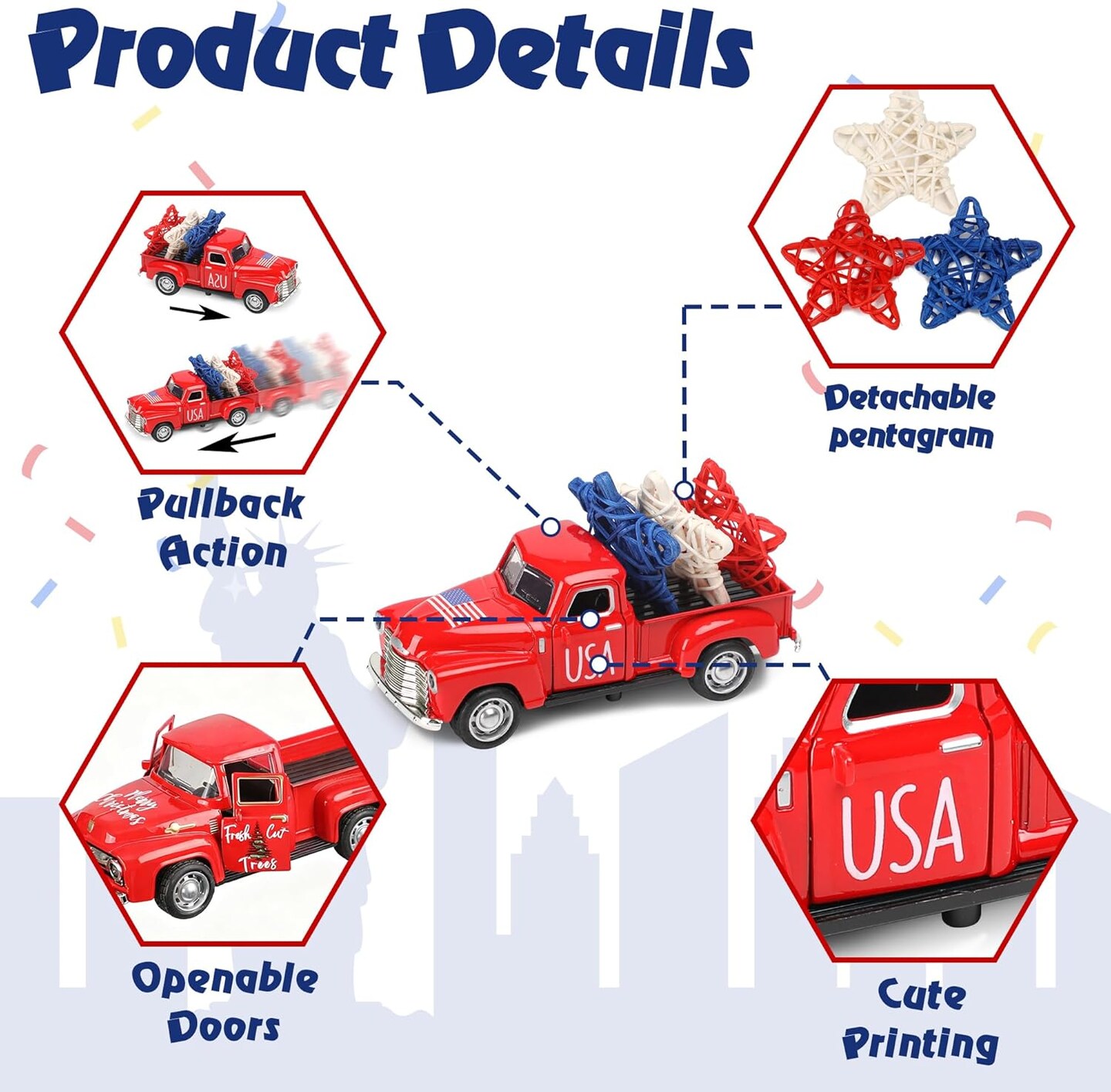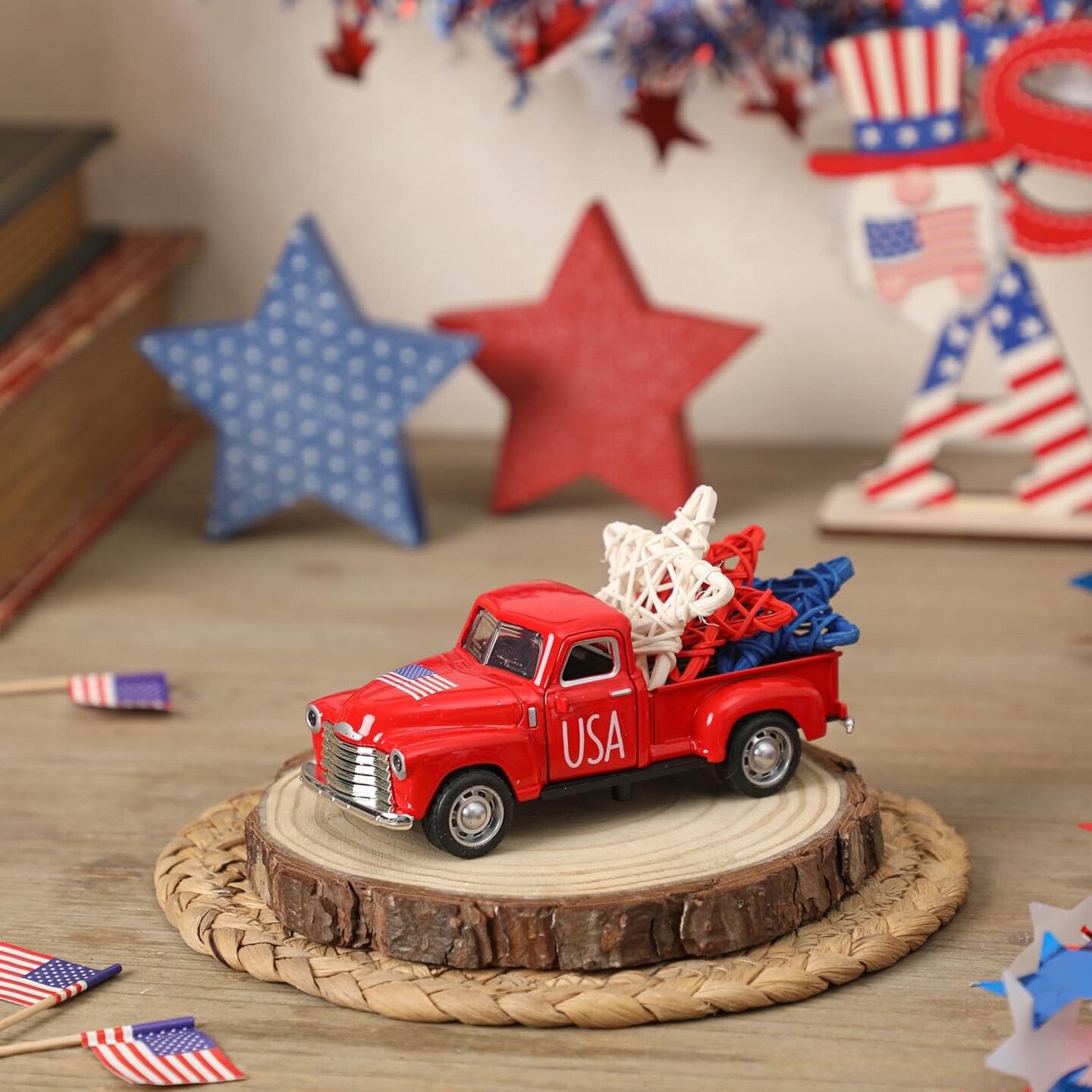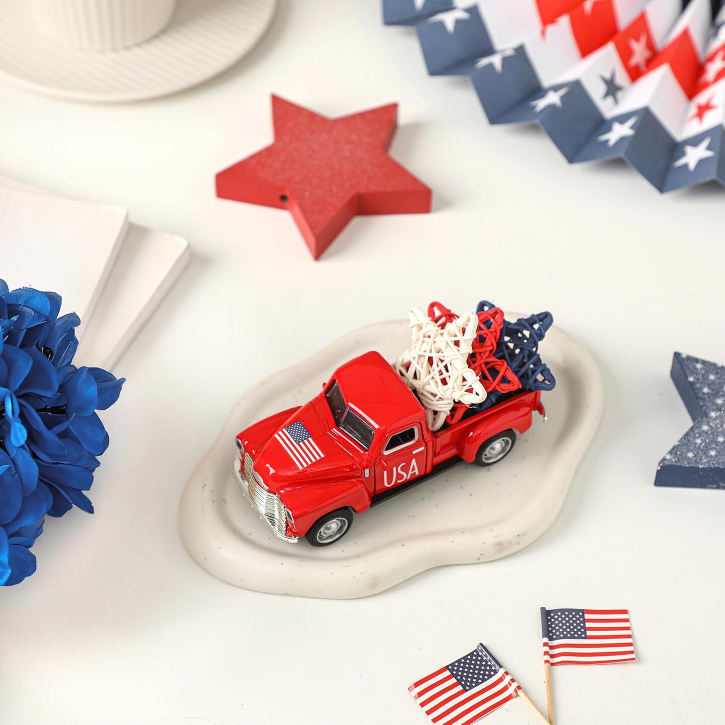 4th of July Truck Decorations – Patriotic Red, White & Blue Metal Farmhouse Truck Centerpieces for Tables, Tiered Trays, Independence Day & Memorial Day