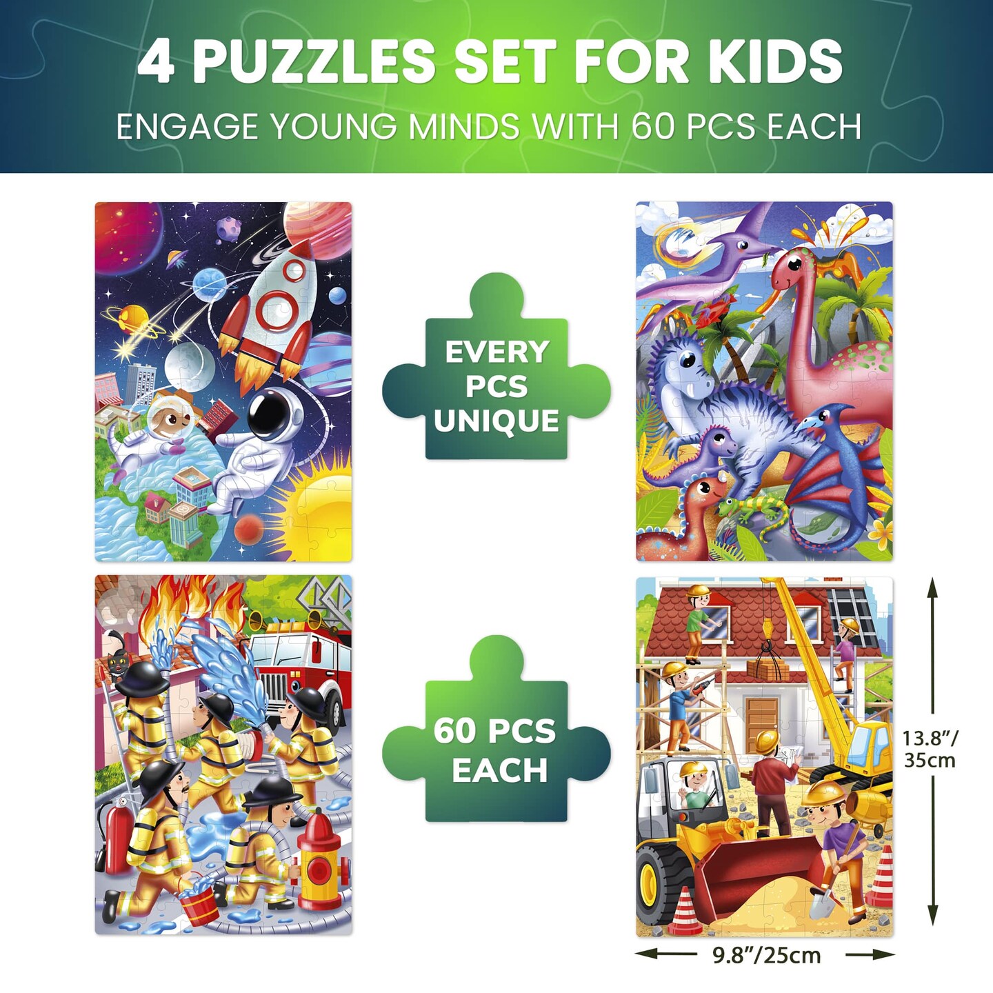 4x60 Jigsaw Puzzles for Kids | Space, Dino, Firefighters