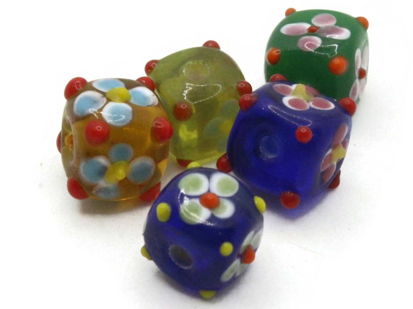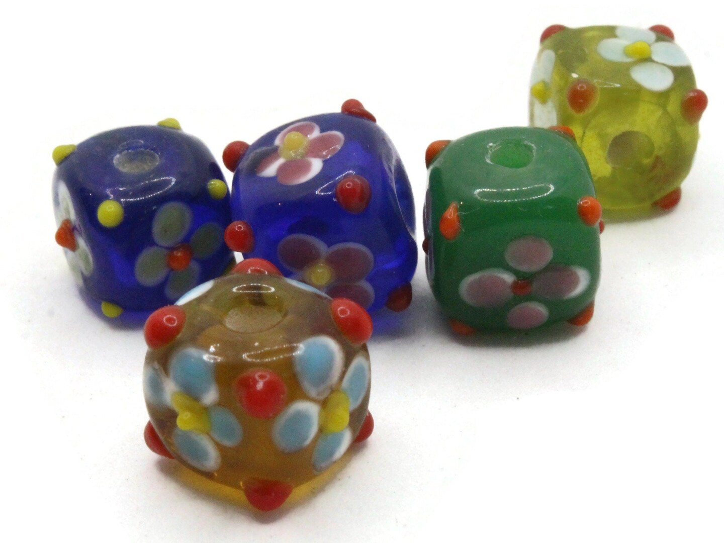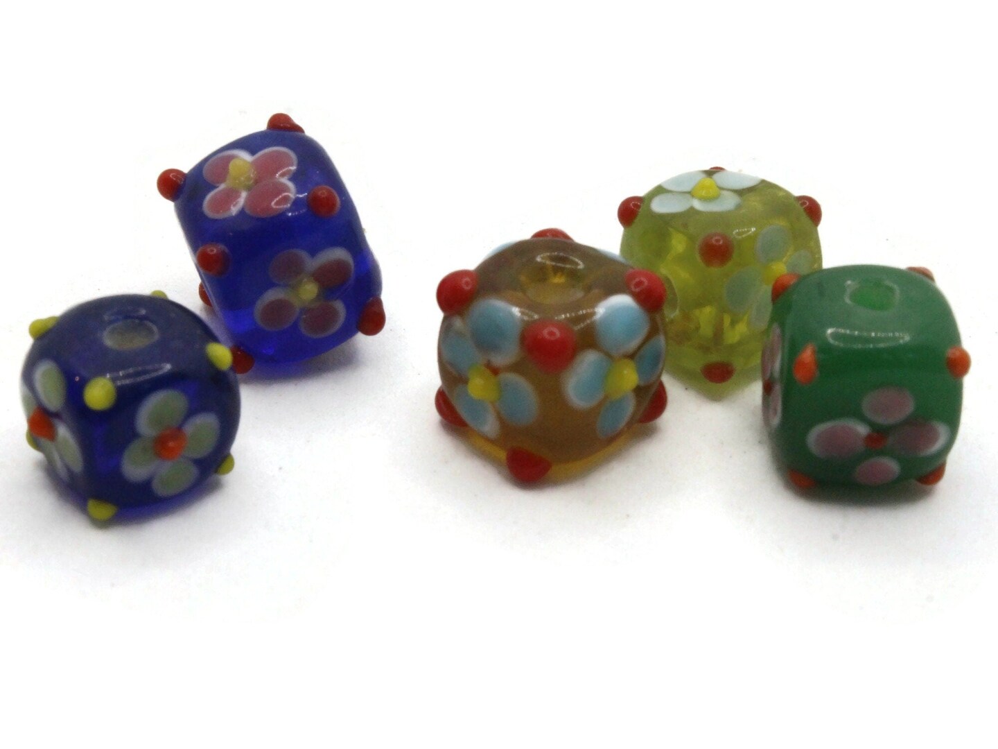 5 10mm Mixed Color Flower Lampwork Glass Cube Beads