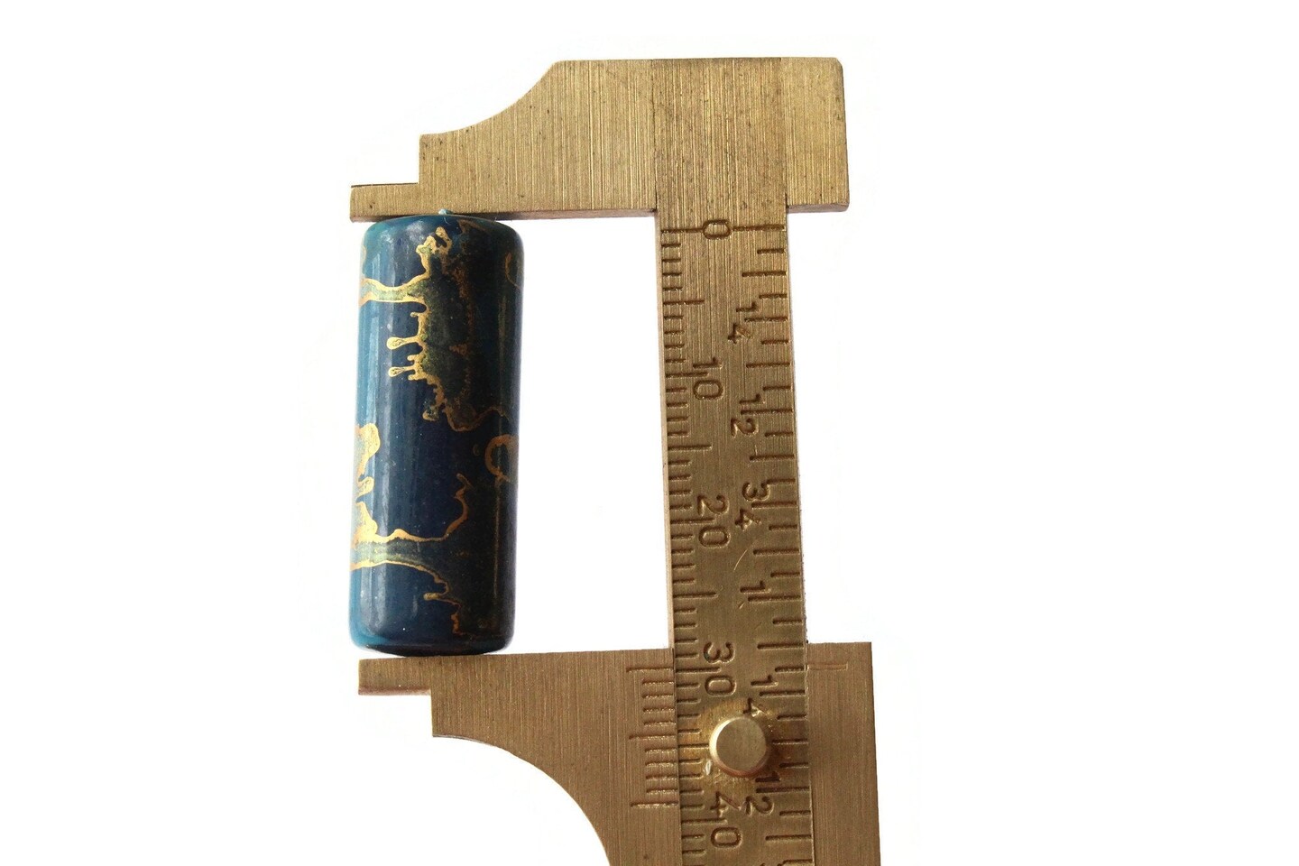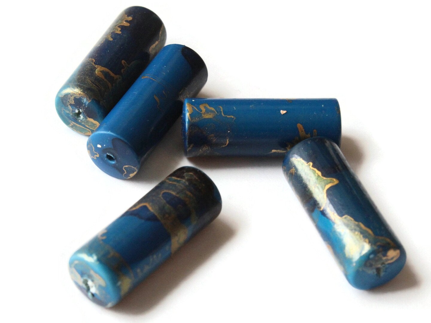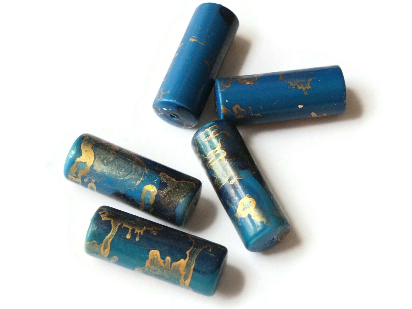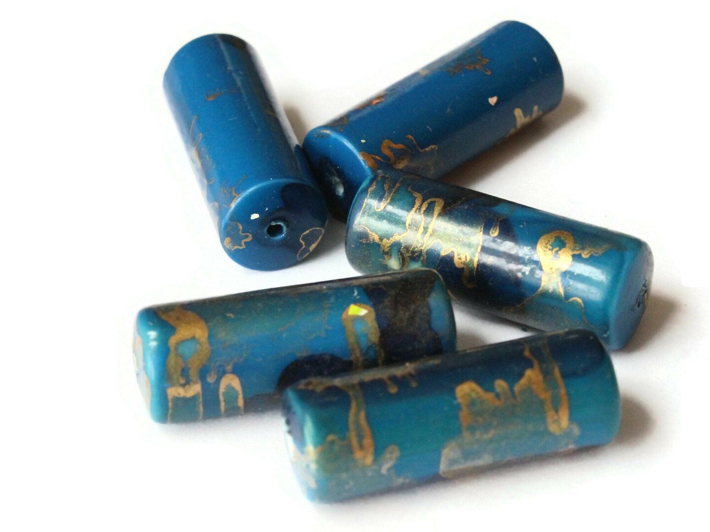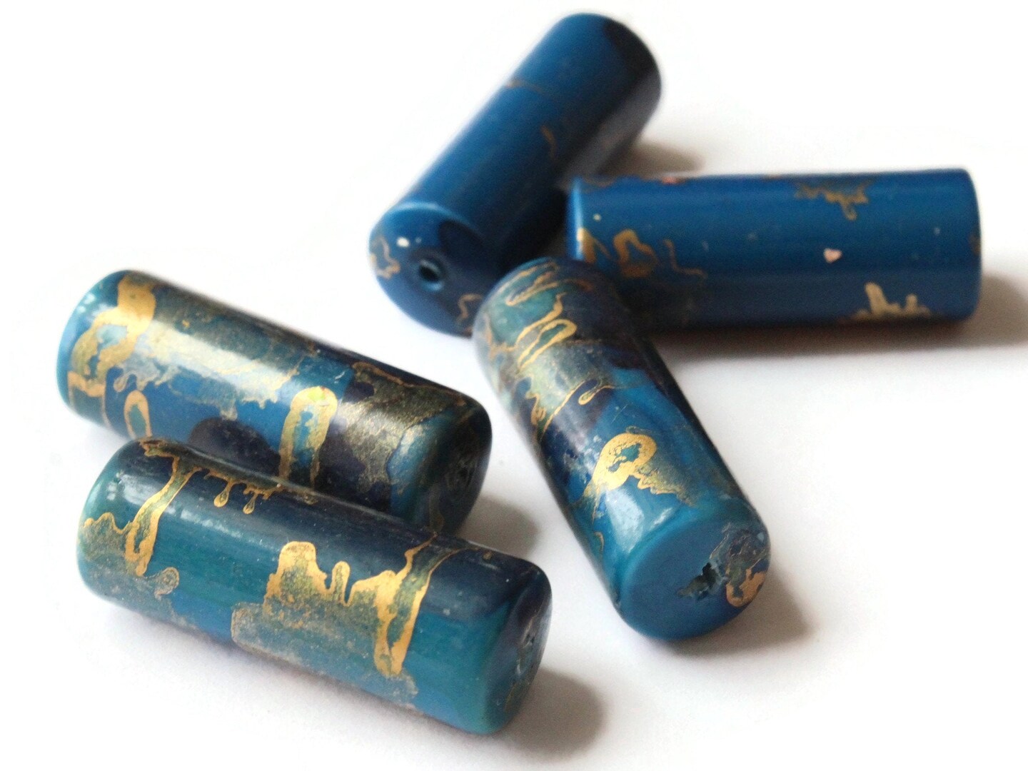 5 30mm Blue and Gold Splatter Paint Tube Beads - Vintage Plastic Beads