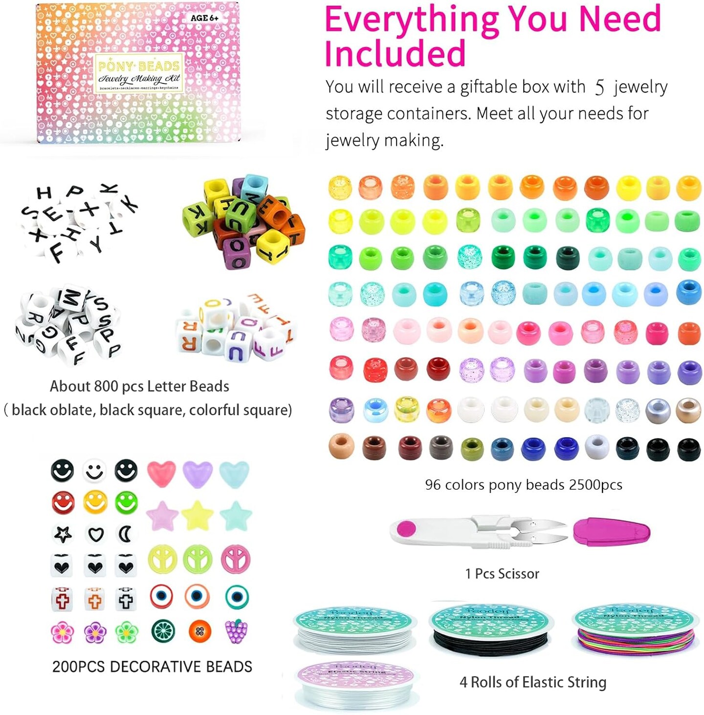 5 Boxes Bracelet Making Kit Pony Beads, 96 Colors 6x9mm Kandi Rave Beads for Bracelets Friendship Plastic Beads with 800Pcs Letter Bead DIY Arts and Crafts for Kids Adults Keychain Jewelry Making
