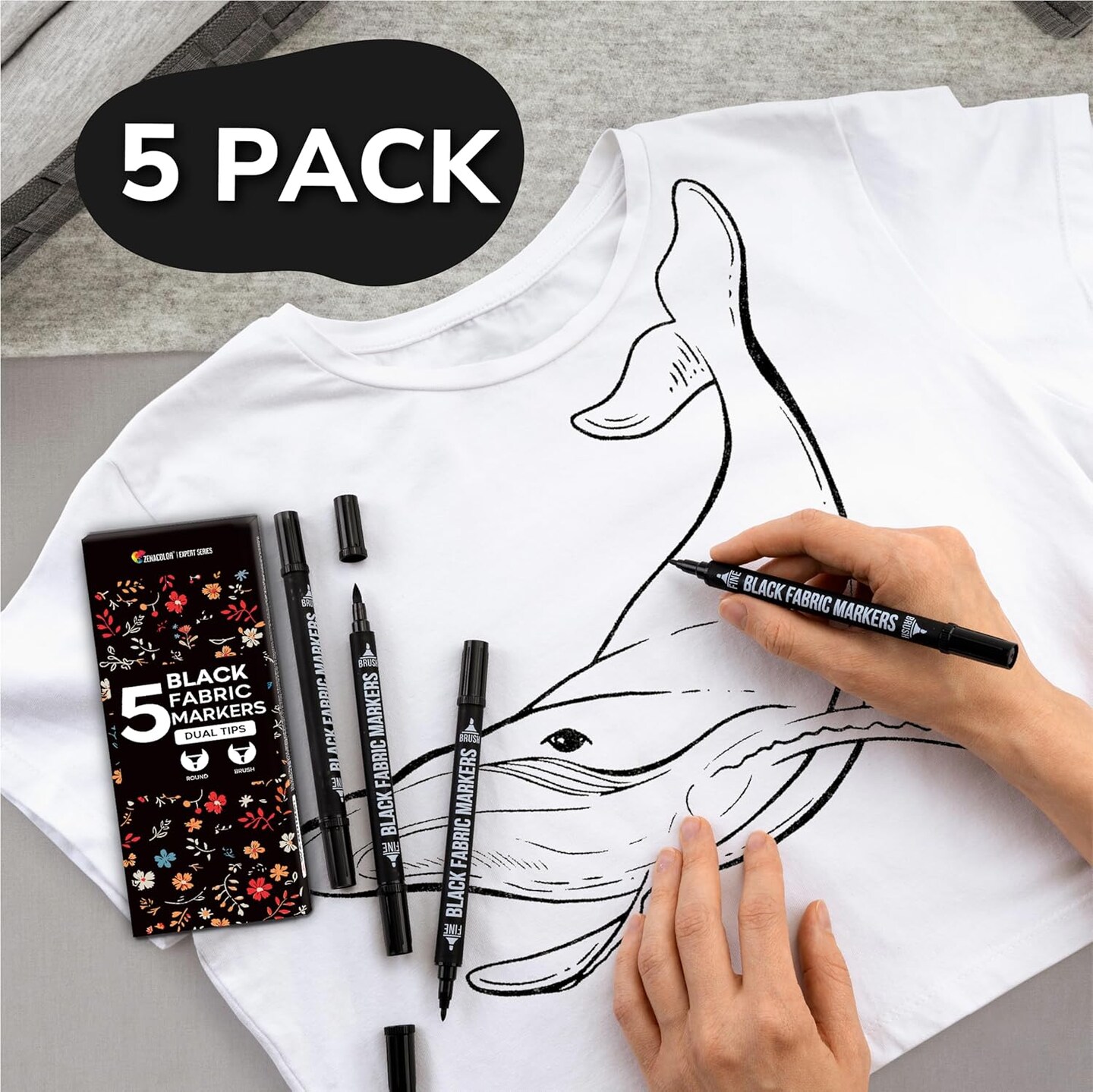 5 Dual-Tip Black Fabric Markers Permanent for Clothes - Fabric Paint Pens for Personalizing Shirts Bags Hats Canvas and Textiles