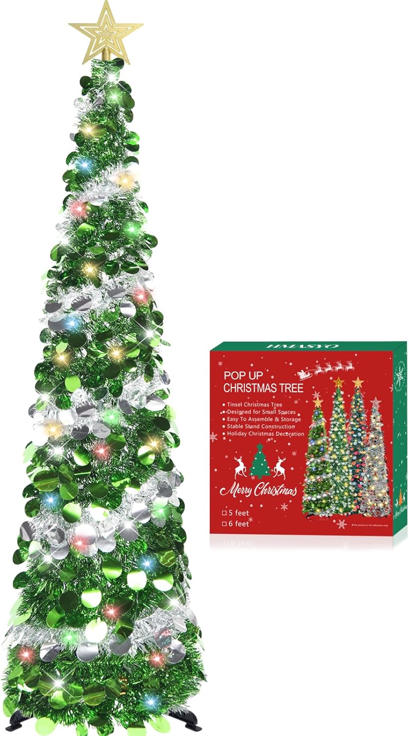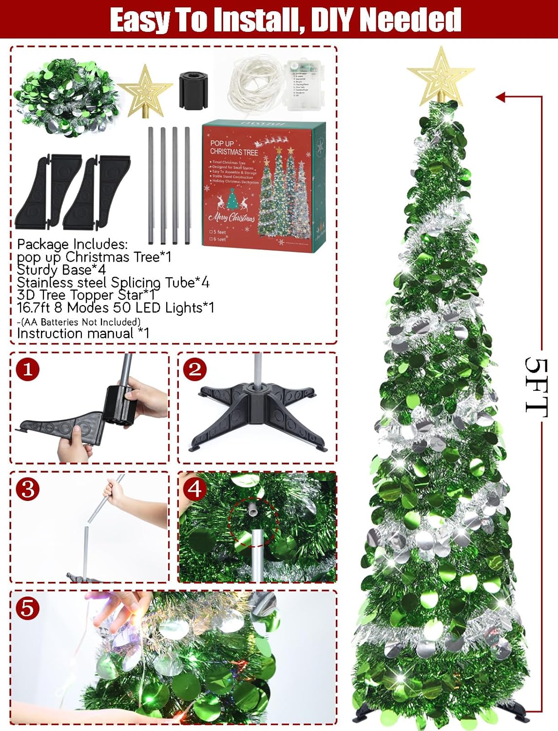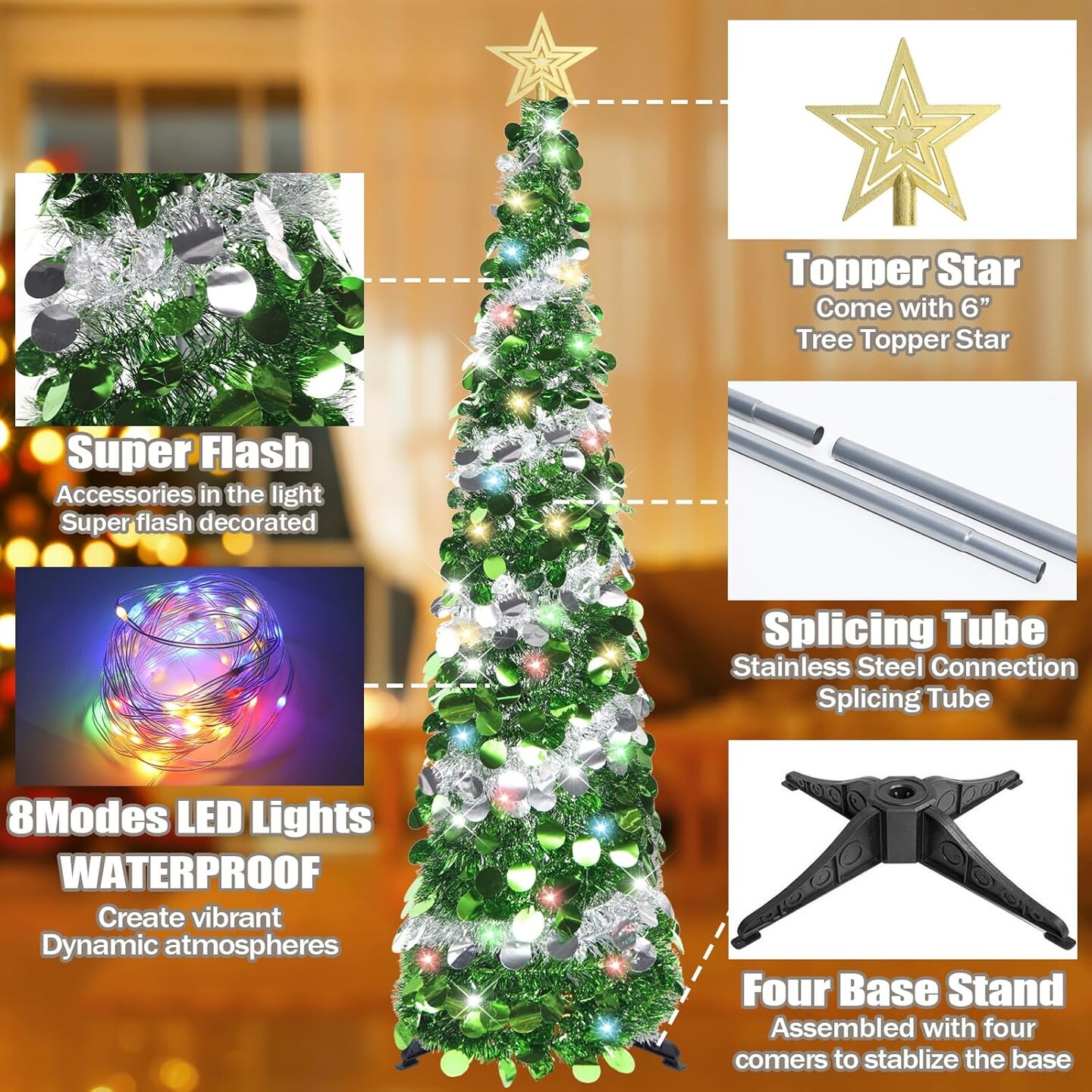 5 FT Pop Up Christmas Tree with Timer, Colorful Lights & Tinsels (Green & Sliver)