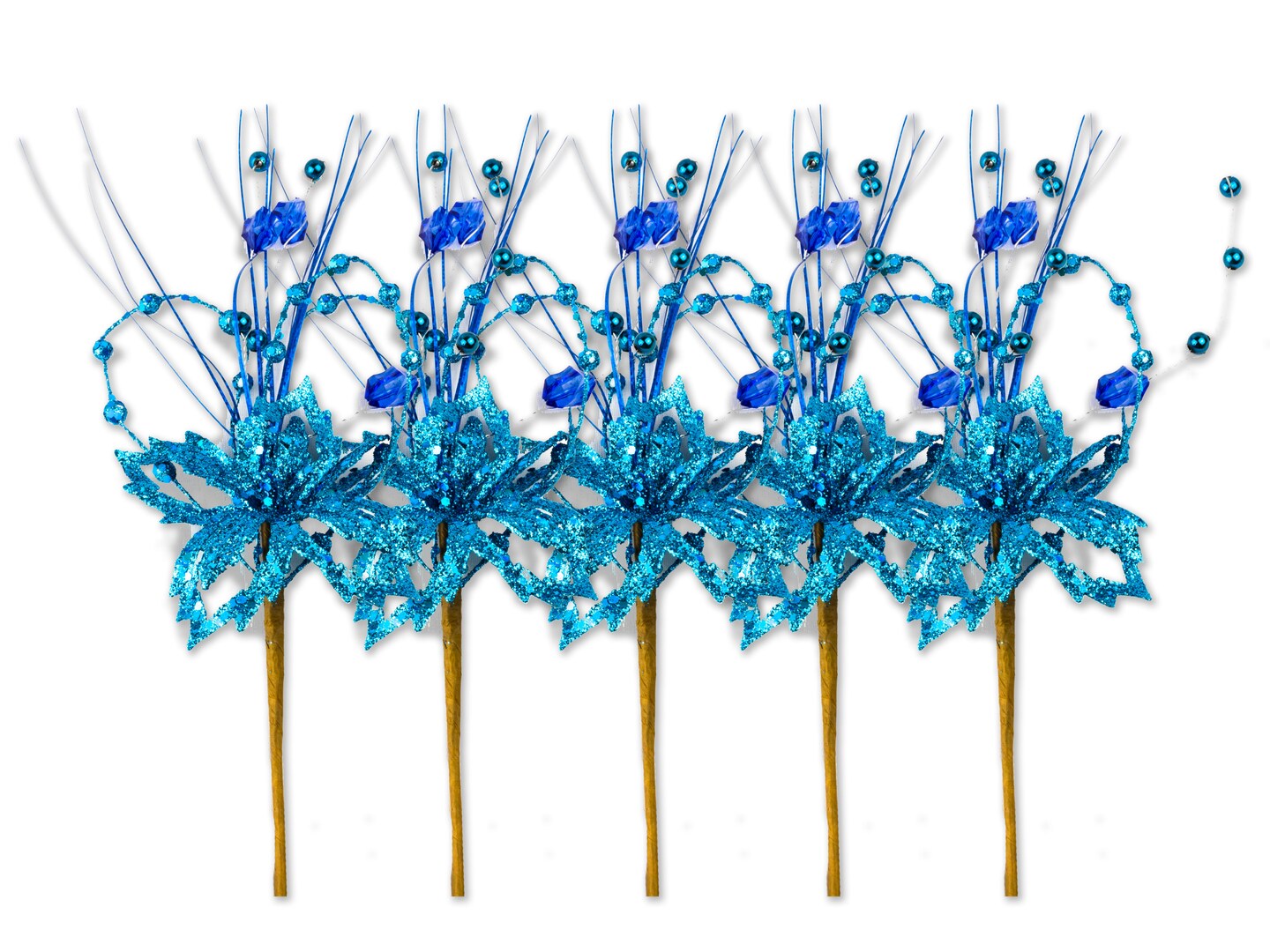 5 Pack of 13" Blue Poinsettia Pick with Berry Accents and Glitter Enhancements