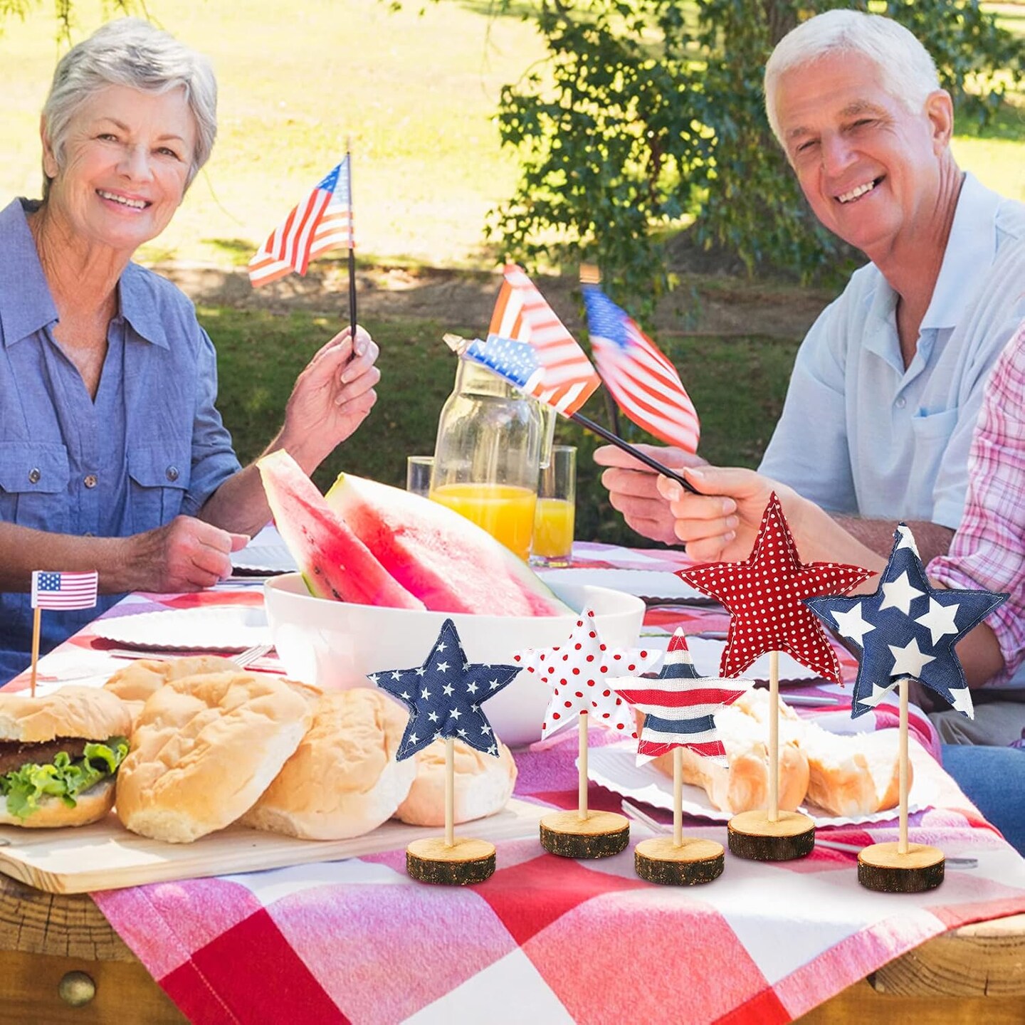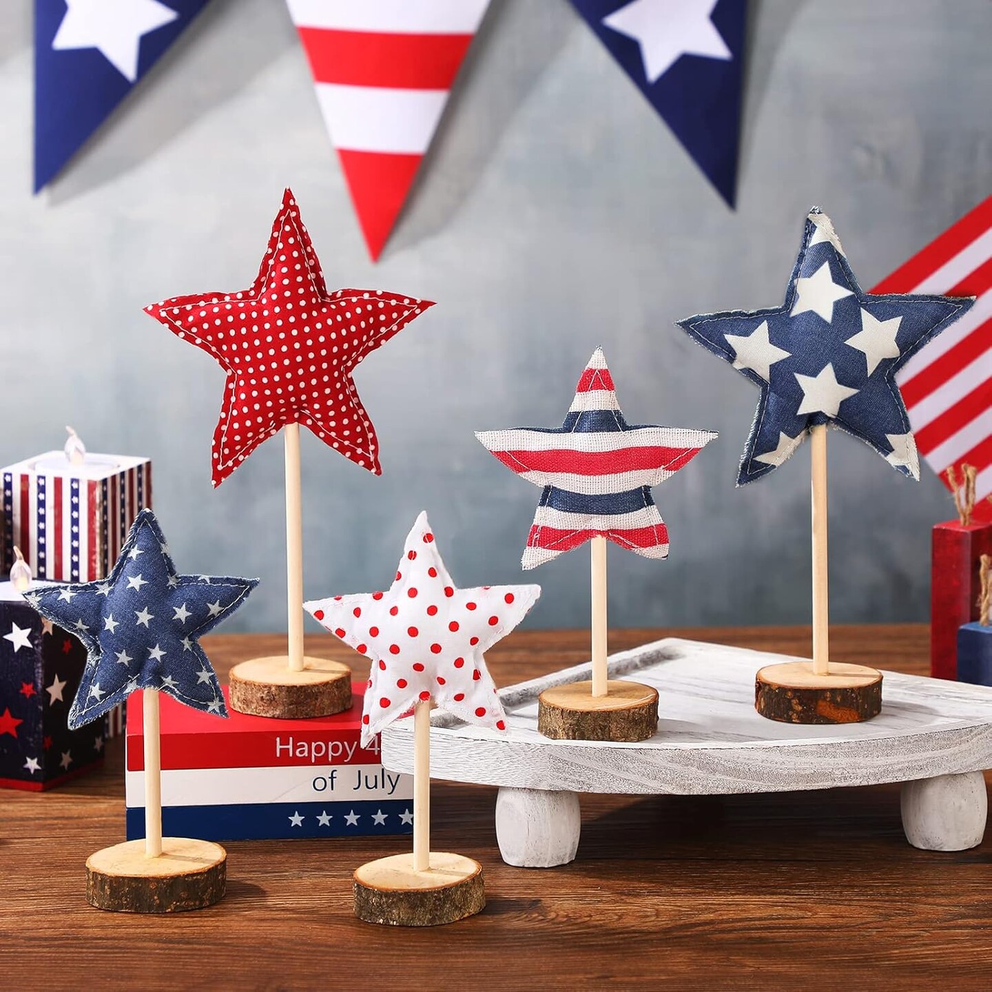 5 Pcs 4th of July Tabletop Centerpiece Standing 3D Star Decor Wood Patriotic Sign Block Fabric Ornaments Rustic Fourth of July Independence Day Crafts for American Festival Party Home Decoration