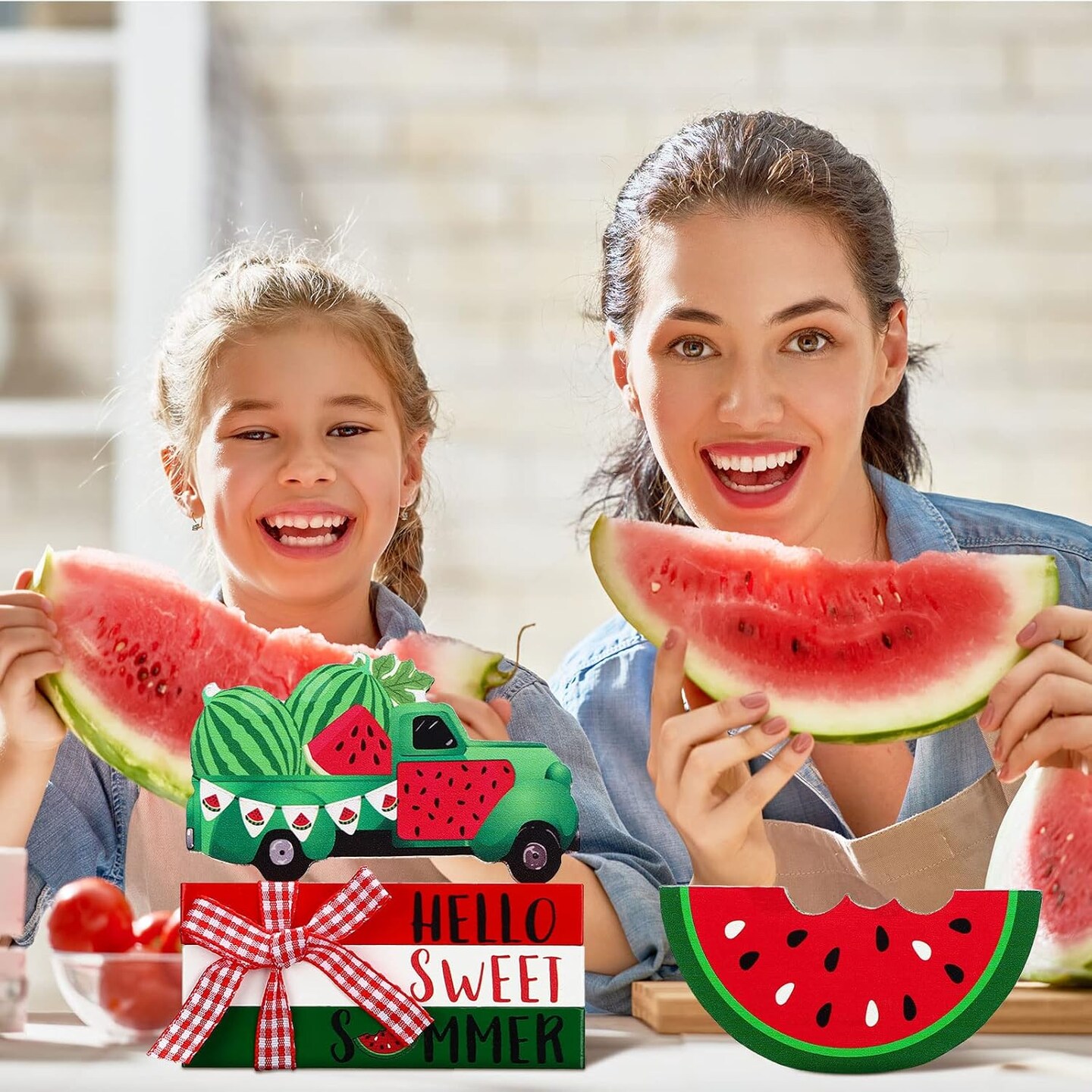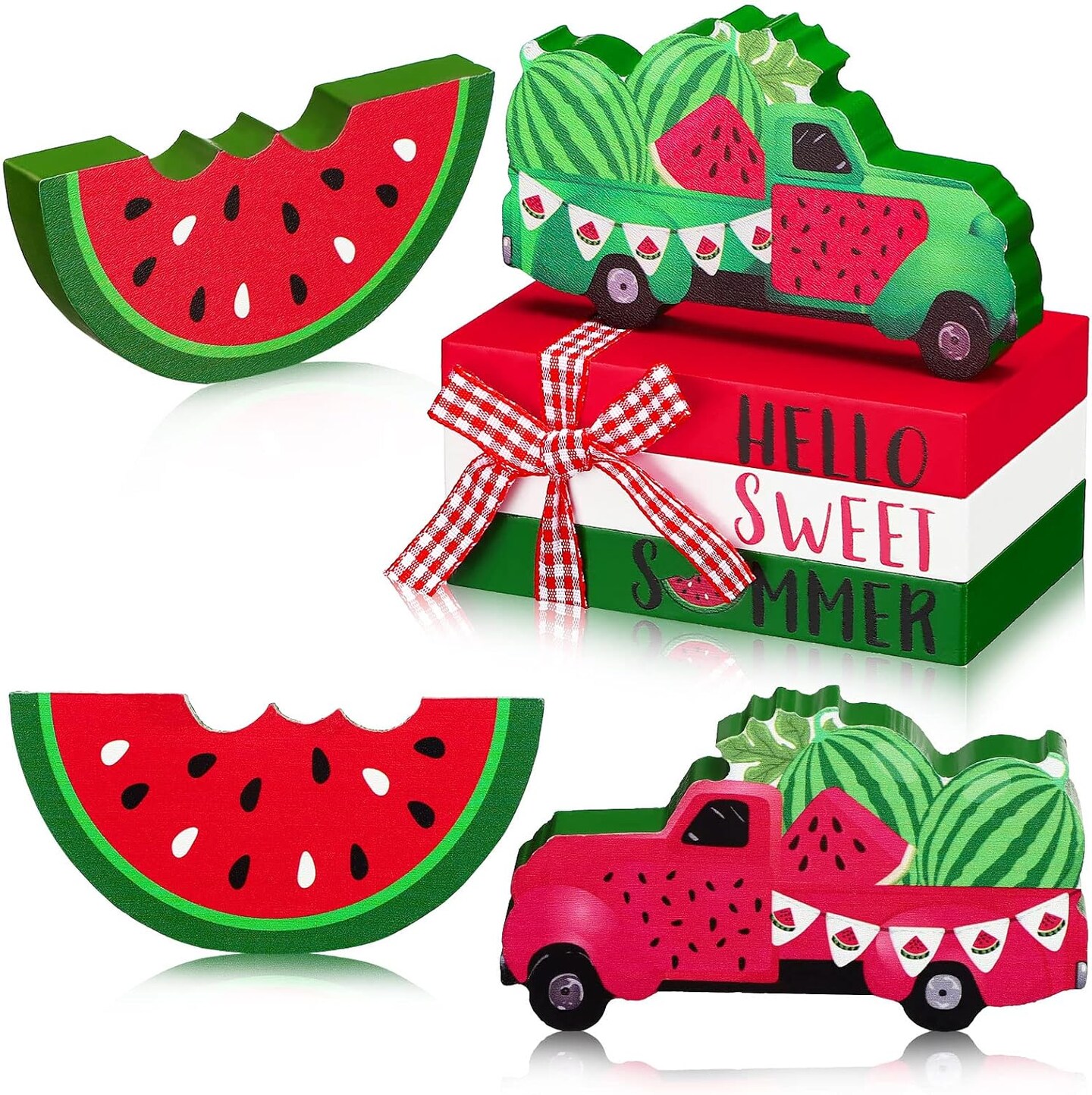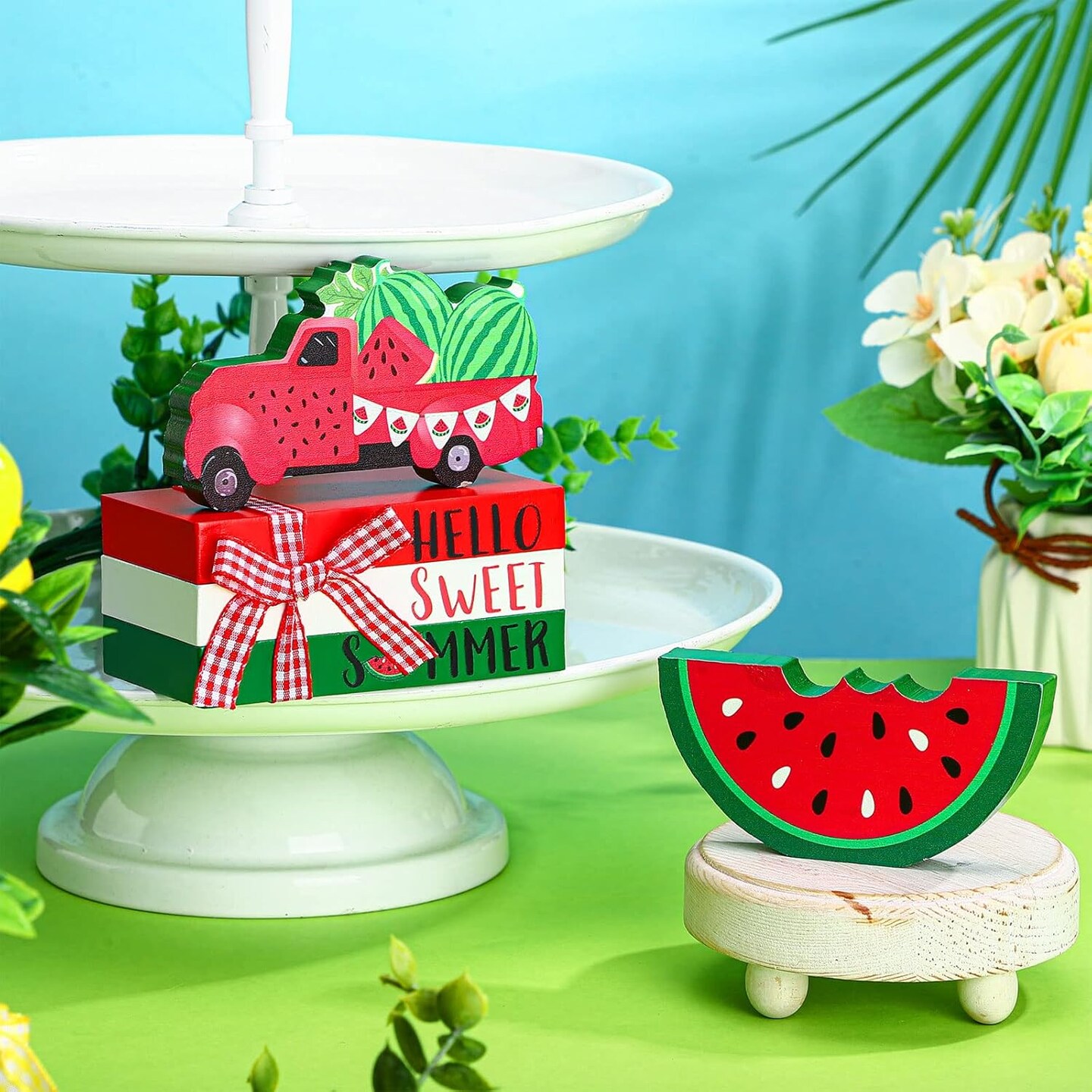 5 Pcs Watermelon Table Decorations Summer Tiered Tray Decor Mini Wooden Decorative Books Stack with Twine with Wood Truck Sign for Home Kitchen Shelf Tabletop Centerpieces