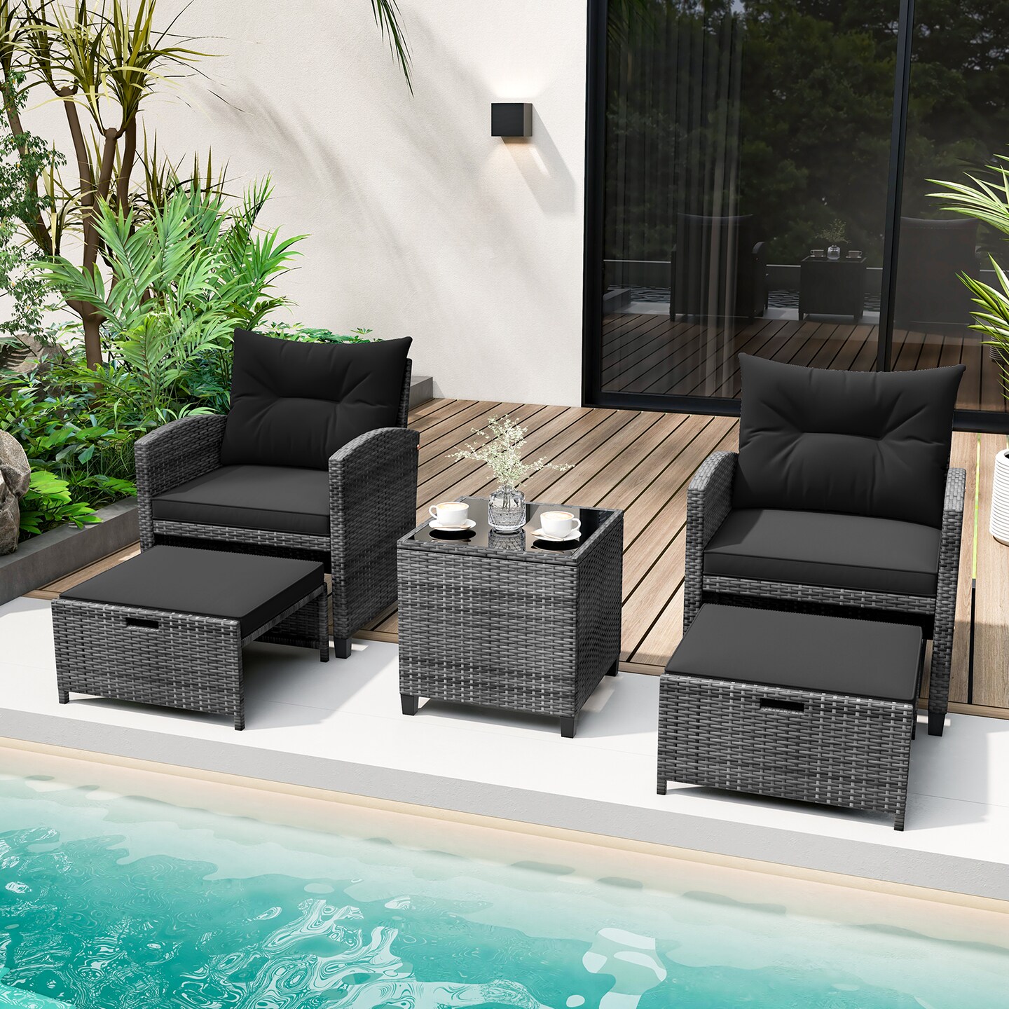 5 Piece Patio Set PE Rattan Chairs Ottomans Glass Table Outdoor Furniture Black Cushion
