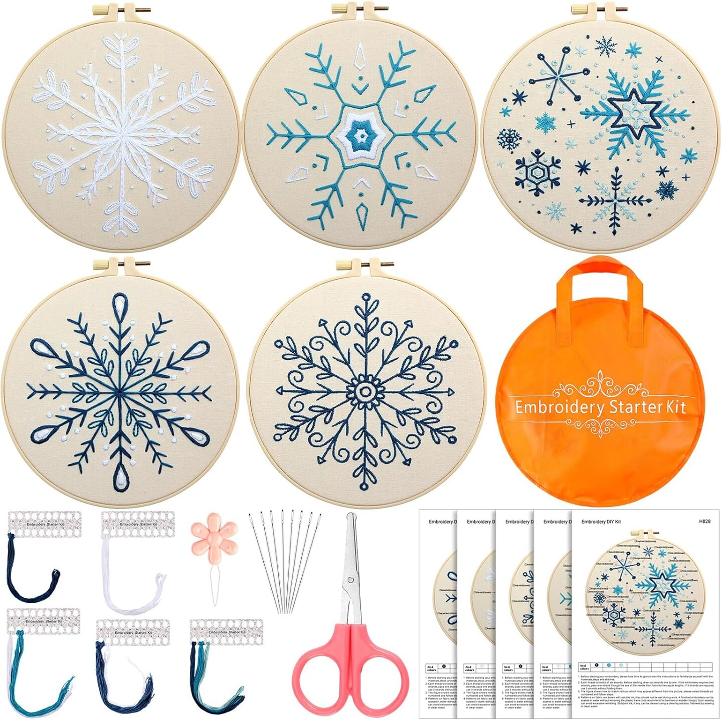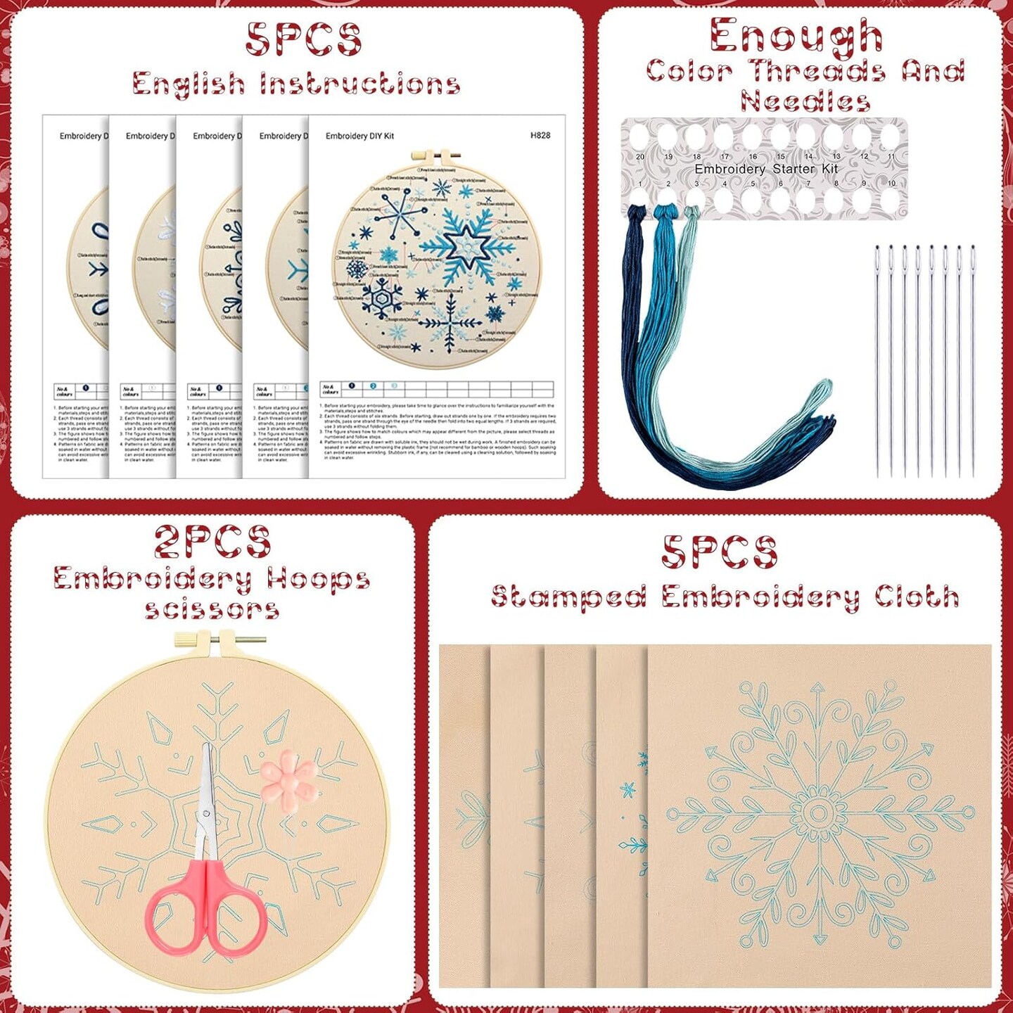 5 Set Christmas Embroidery Starter Kit with Snowflake Pattern, Winter Embroidery Kits for Beginners, Full Range of Winter Cross Kits, Embroidery Hoops and Color Threads