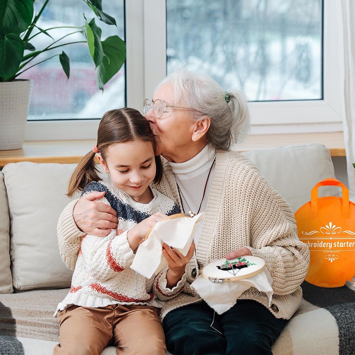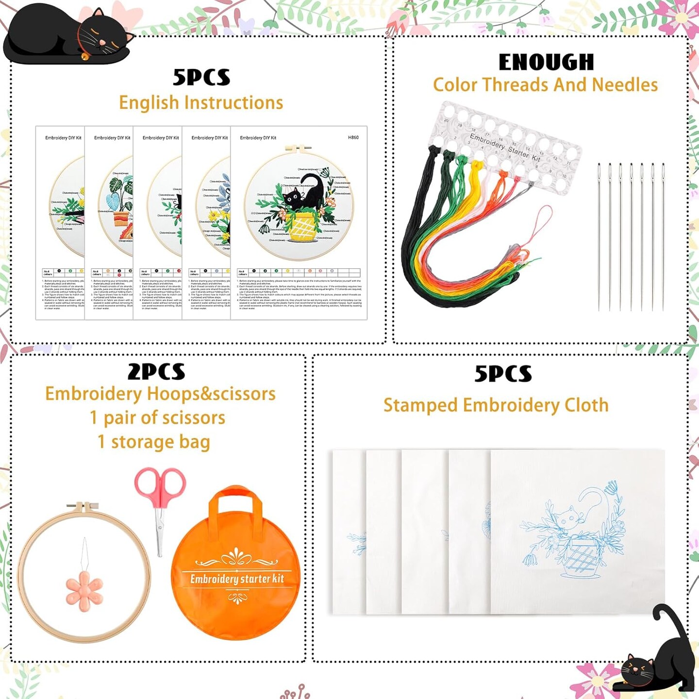 5 Sets Embroidery Starter Kit with Black Cat Patterns and Instructions