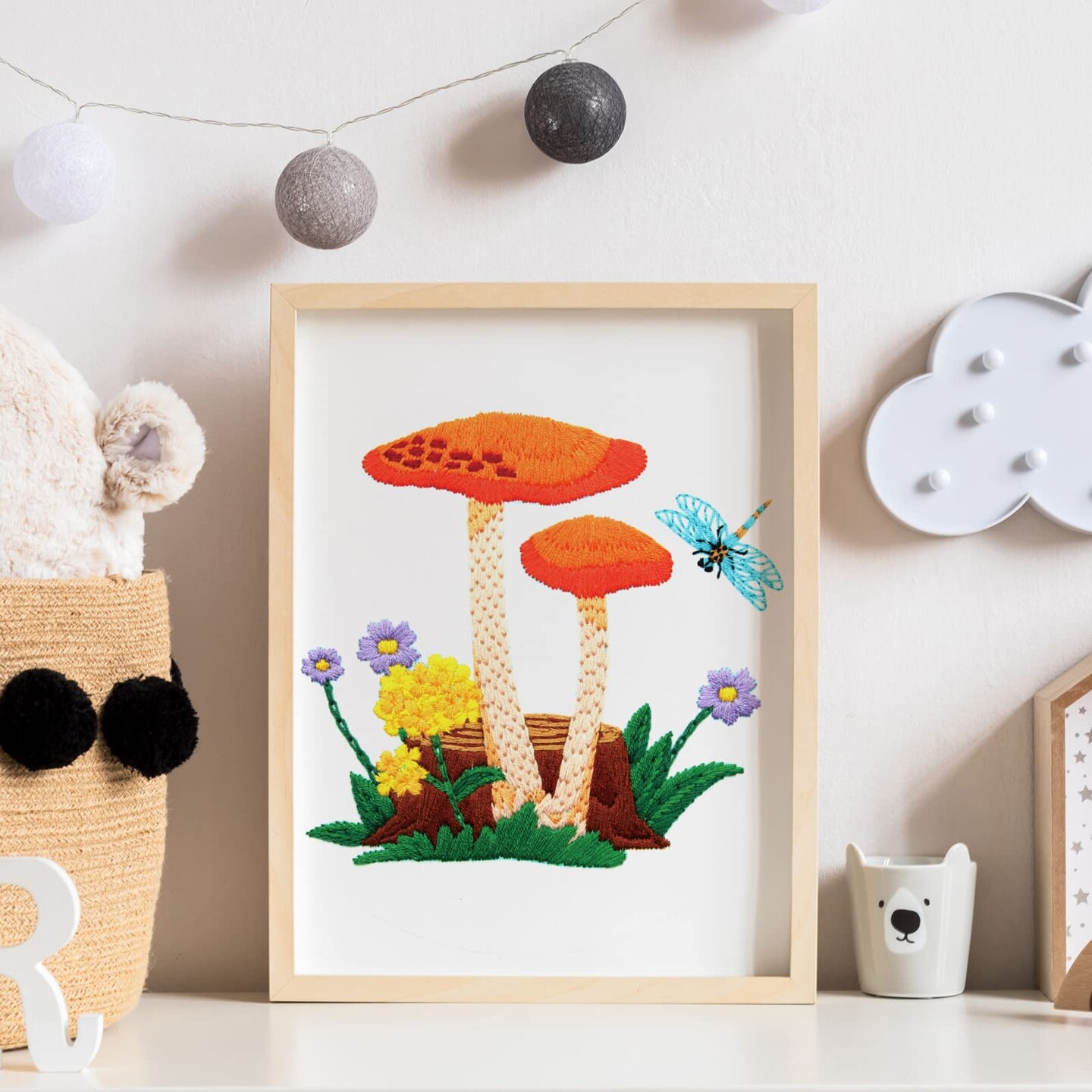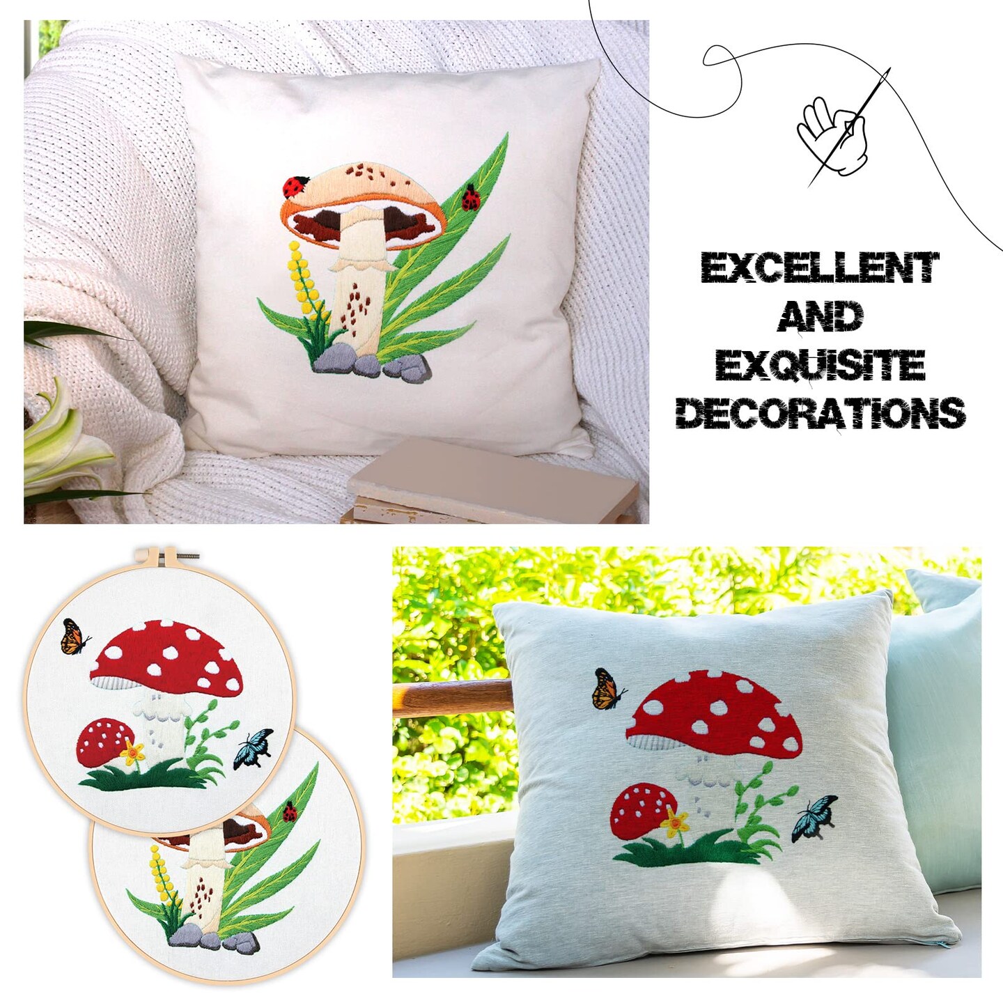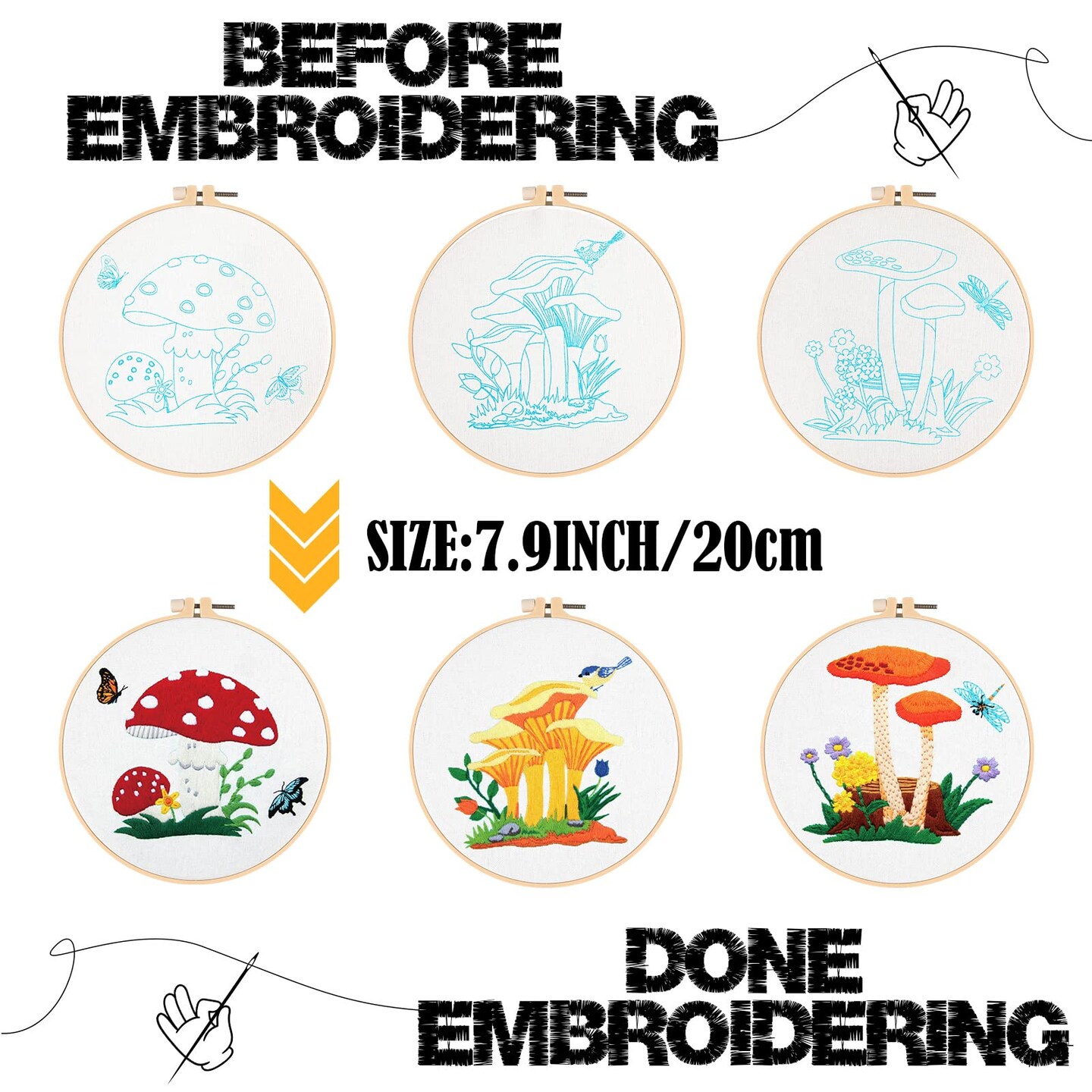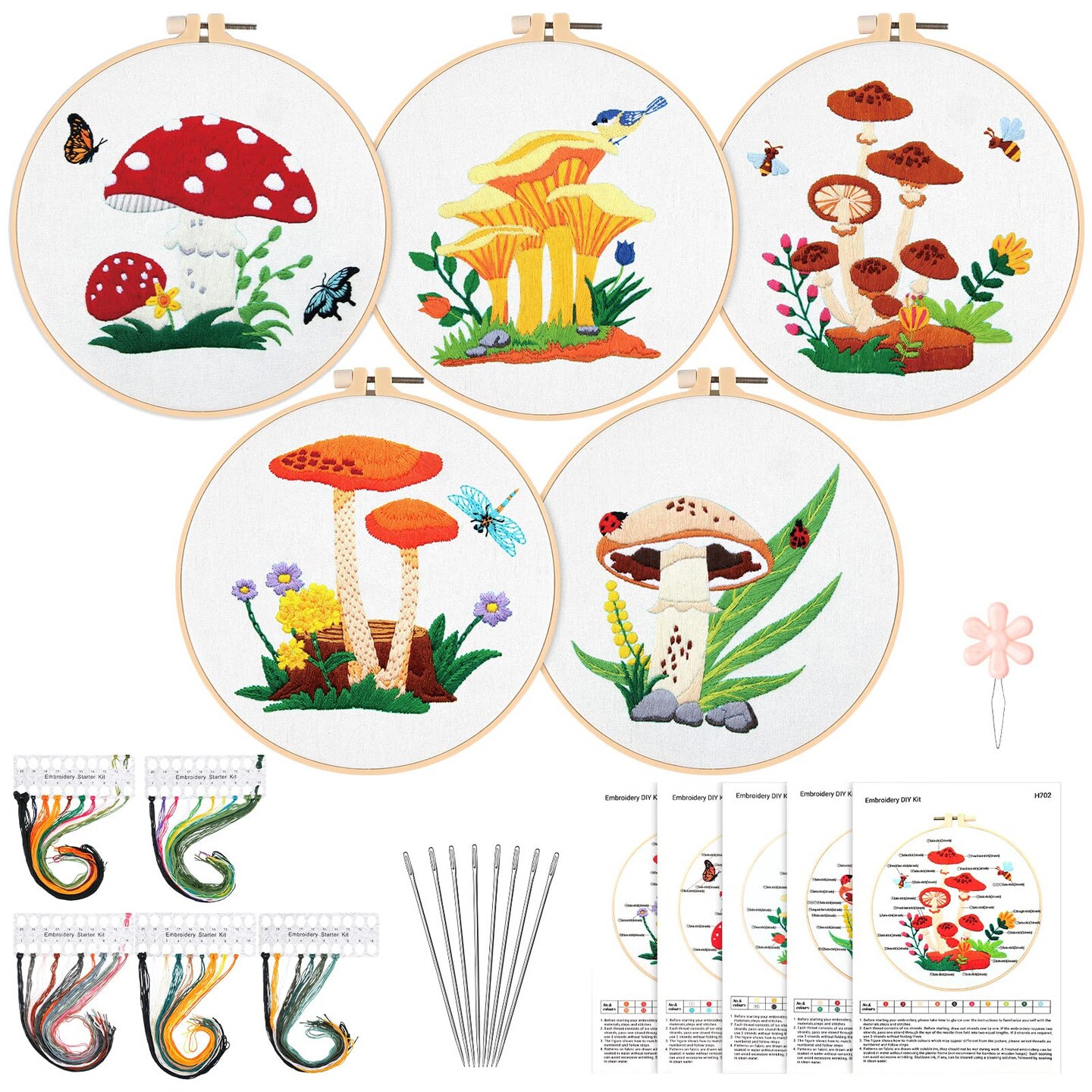 5 Sets Mushroom Embroidery Kit for Beginners with Pattern and Instructions Include Embroidery Cloth Hoops Threads for Craft Lover Hand Stitch DIY Adult Hand Needlepoint