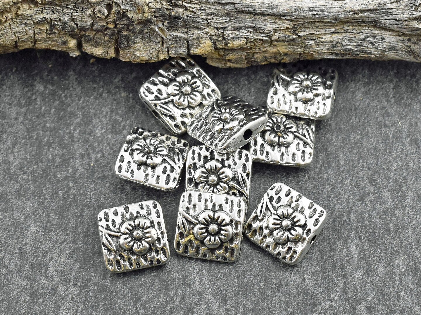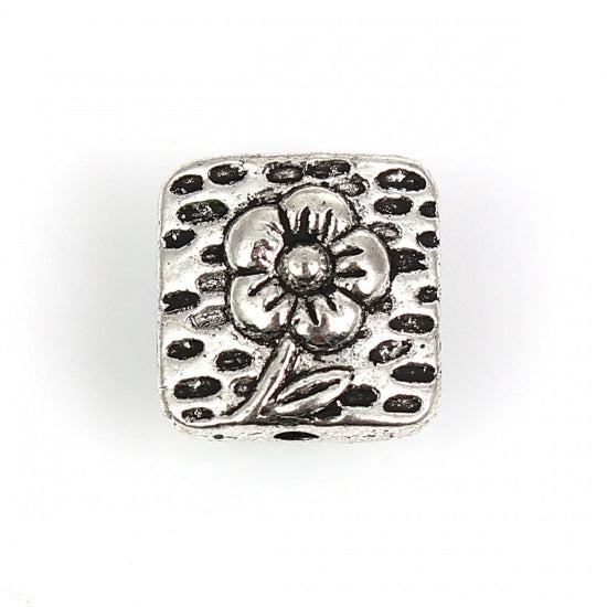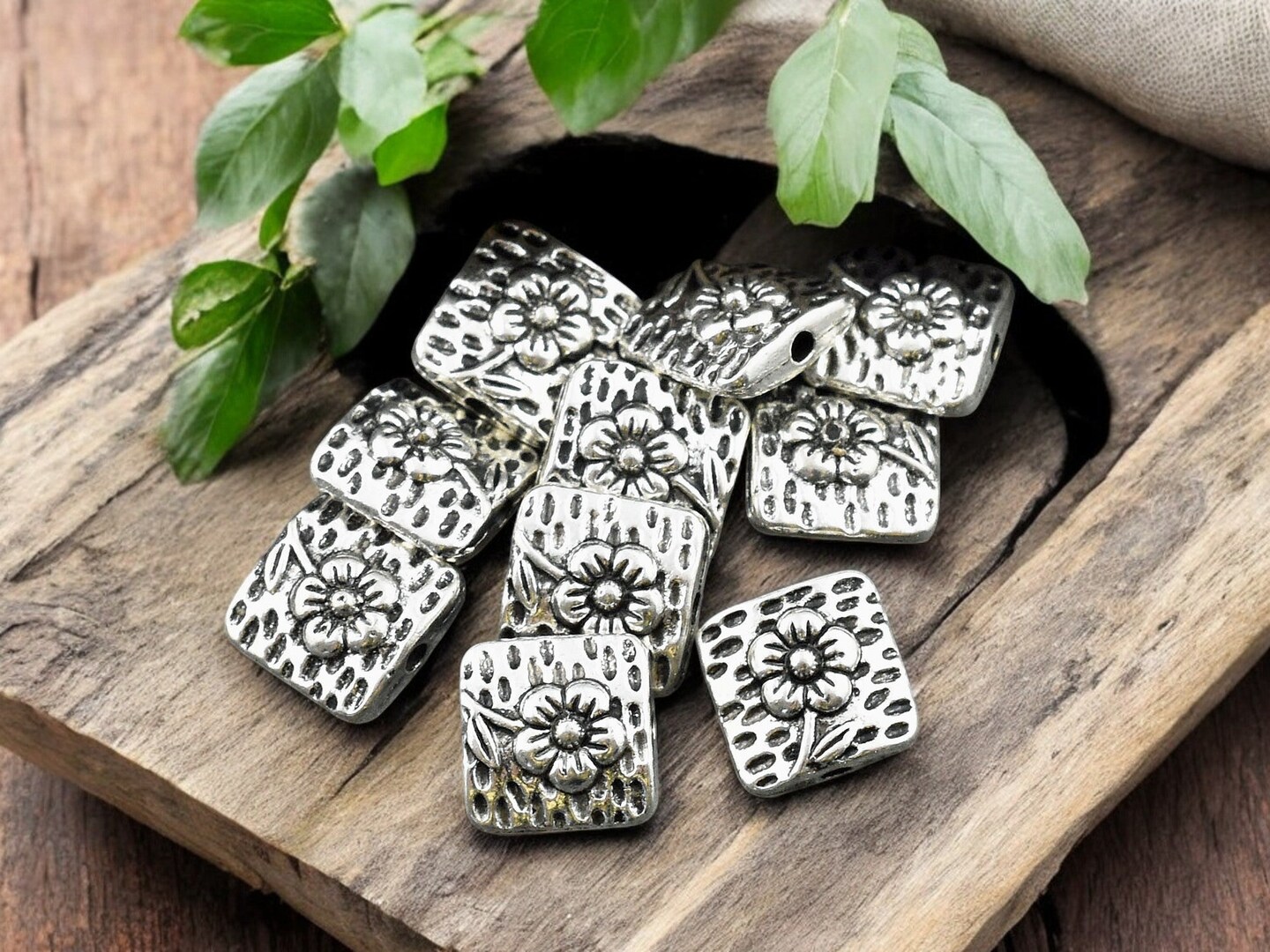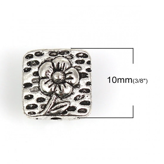 *50* 10mm Antique Silver Flower Design Beveled Square Beads