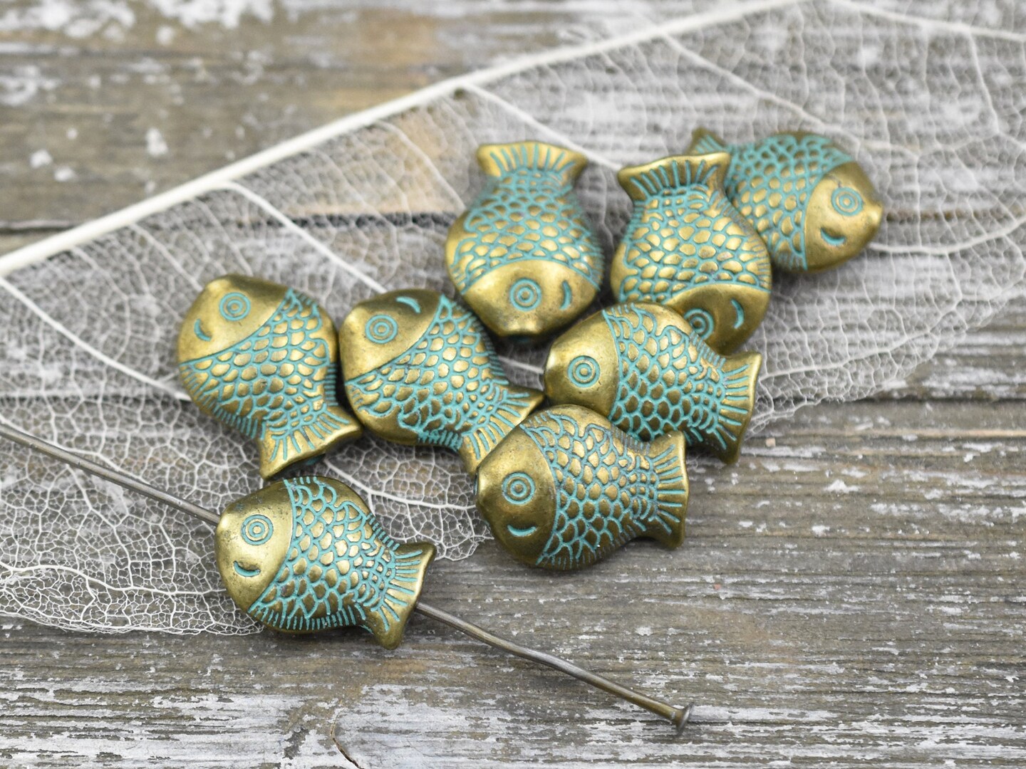 *50* 14x10mm Bronze Green Patina Fish Beads