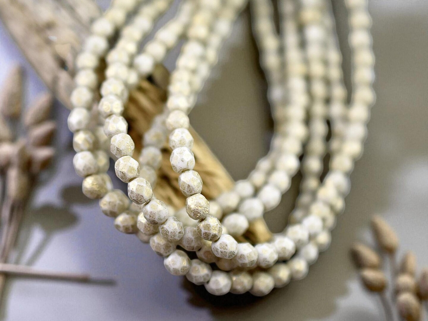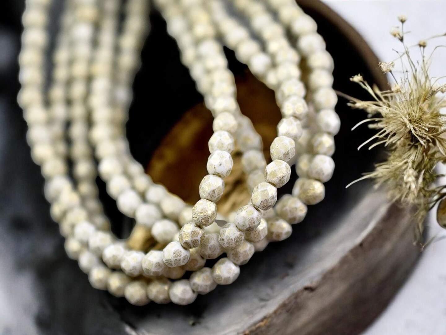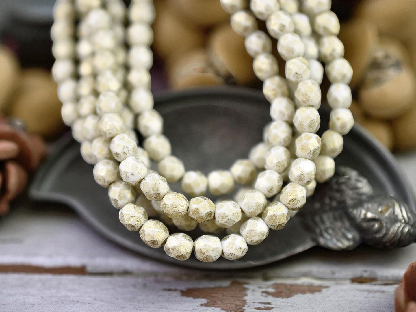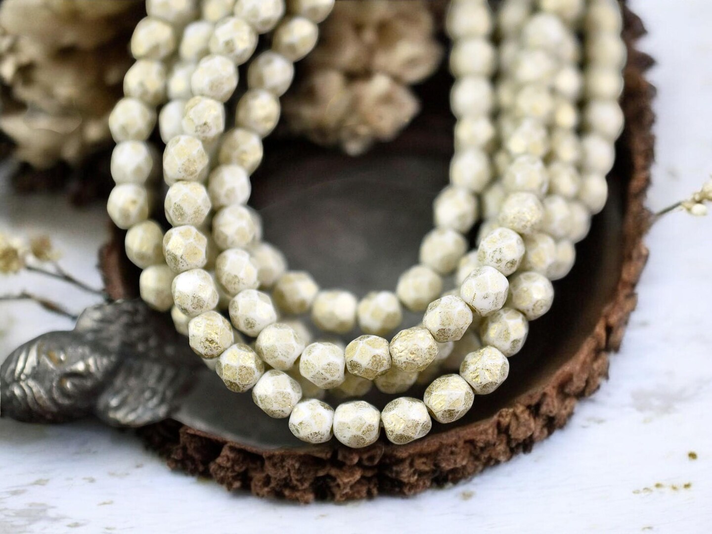 *50* 4mm Gold Etched Antique White Fire Polished Round Beads
