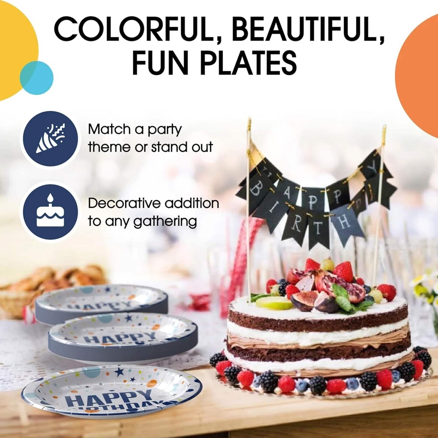 50 Count Blue Birthday Print Paper Plates 7 Inch Disposable Party Celebrations
