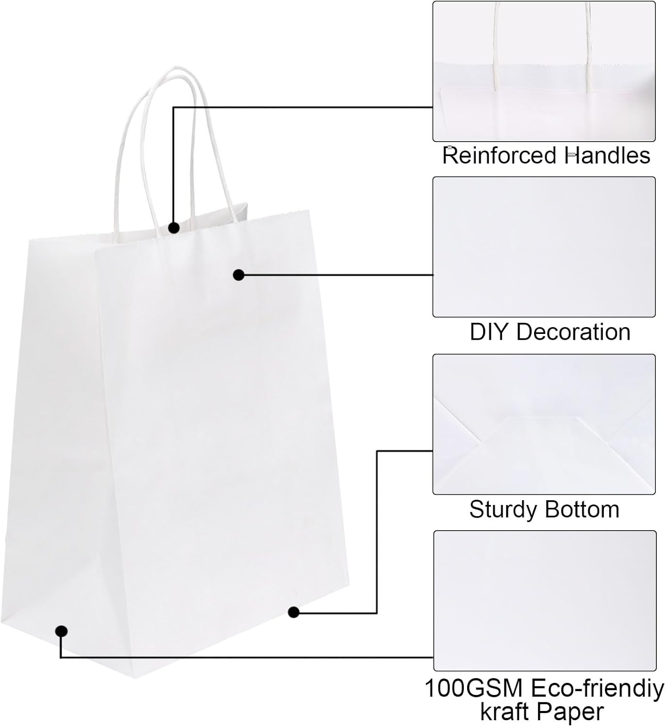 50 Pack 8x4.75x10 Inch Medium White Kraft Paper Bags with Handles Bulk (50pcs)
