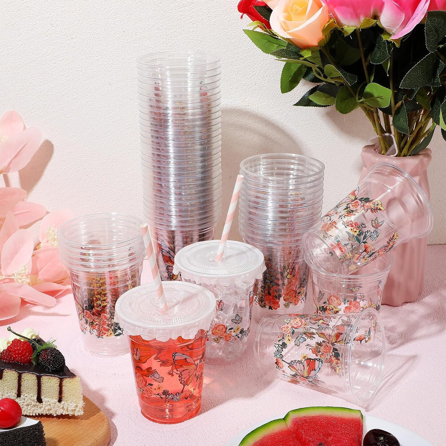 50 Pcs 12 oz Disposable Plastic Cups with Straws, Lids and Leakproof Paper Clear Birthday Party Cups Supplies Birthday Table Decorations